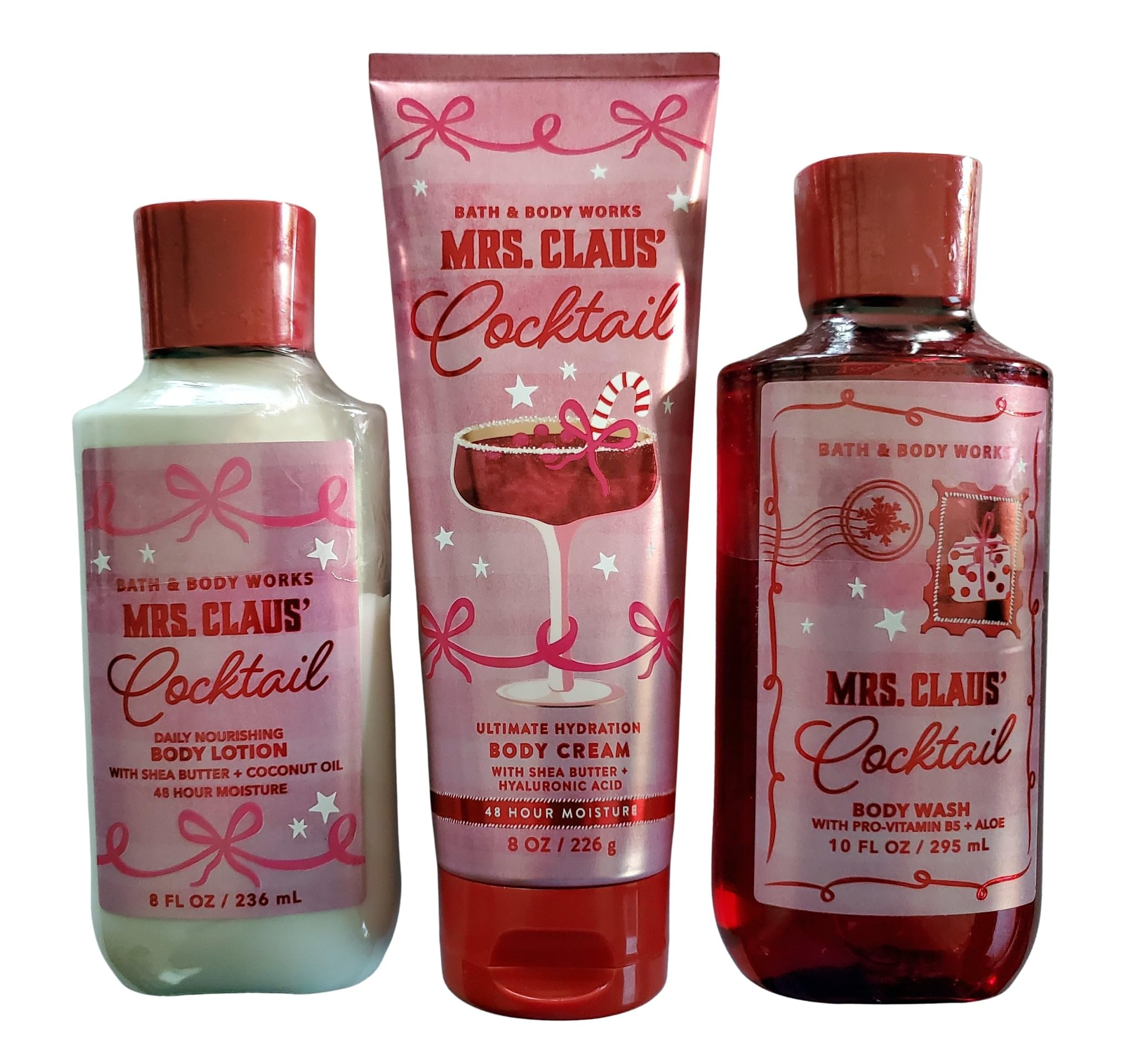 Packaging may vary due to seasonal refresh from manufacturer. Set Includes: Lotion 8 ounce, Body Wash 10 ounce, Body Cream 8 Ounce. What it smells like: one part merry, two parts bright garnished with a sprig of jolly—on ice. Fragrance notes: sparkling cranberry, pomegranate juice and frosted citrus twist.