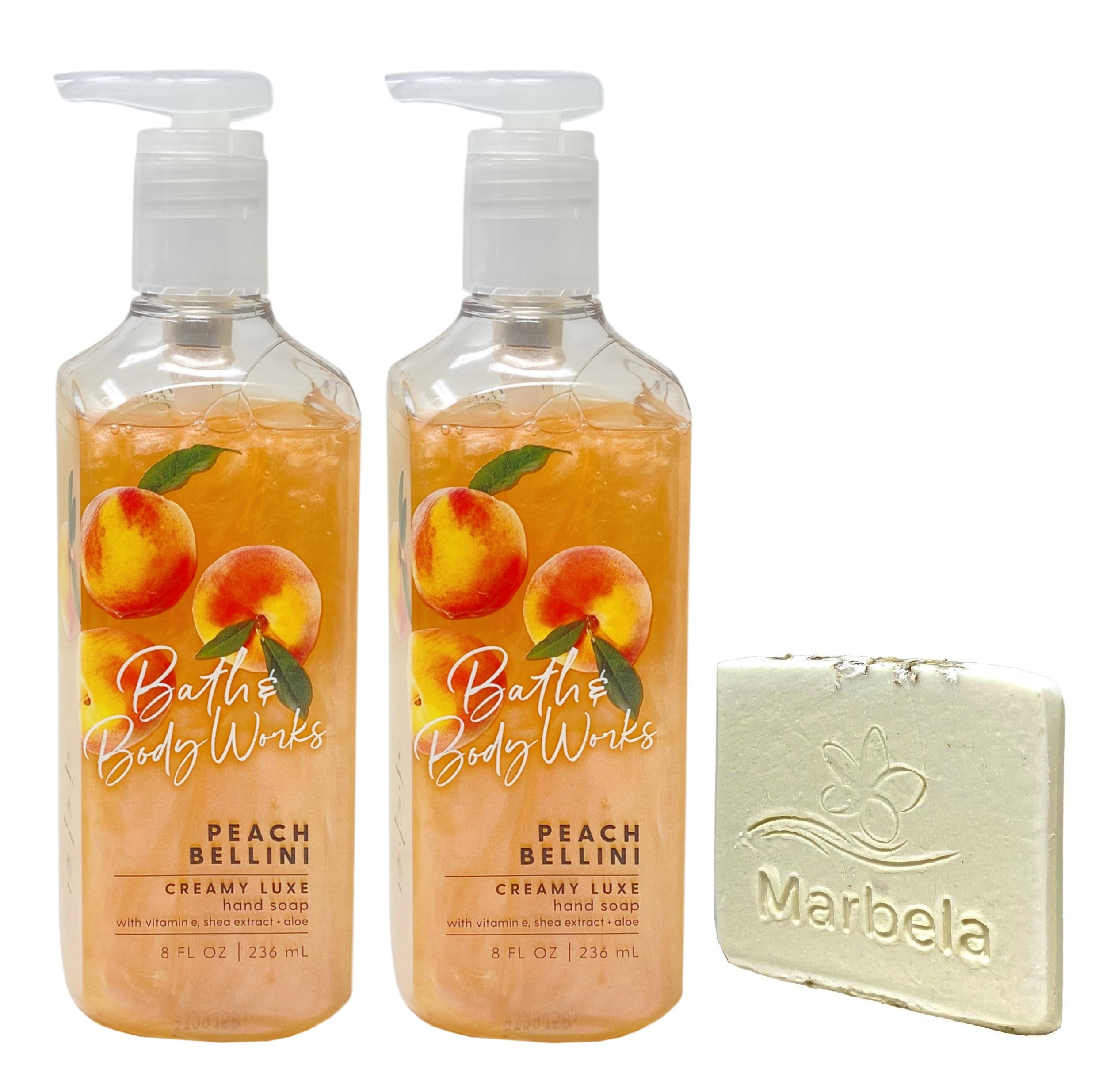 Bath Body Works Peach Bellini 2 Pack Creamy Luxe Hand Soap Bundle with a Marbela Natural Oats Sample Soap (Ingredients: Saponified Oils of: Olive Oil, Organic Virgin Coconut Oil, Shea Butter, Sweet Almond Oil, Castor Oil, Vitamin E, Oats, Titanium Dioxide).