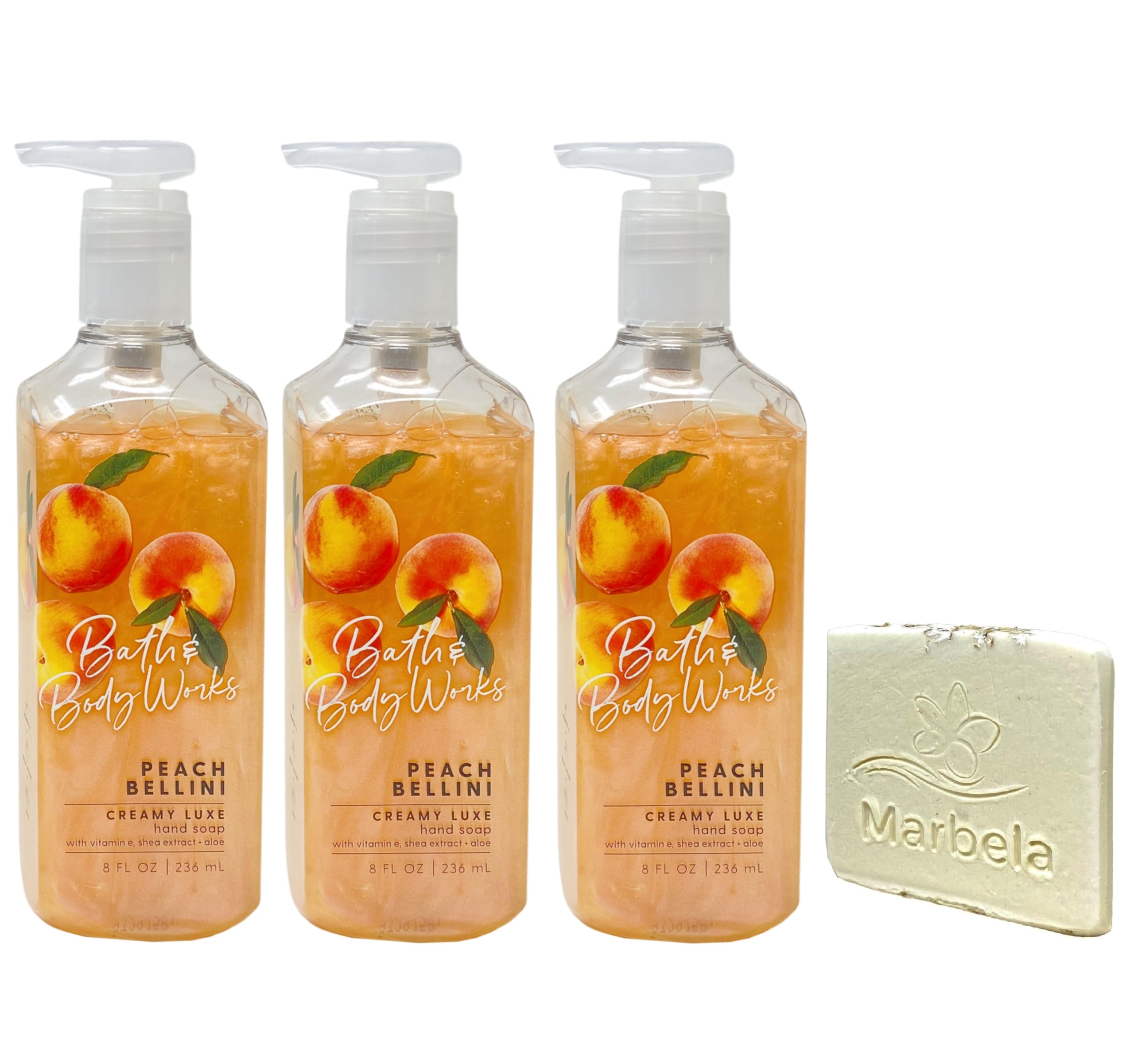 Bath Body Works Peach Bellini 3 Pack Creamy Luxe Hand Soap Bundle with a Marbela Natural Oats Sample Soap (Ingredients: Saponified Oils of: Olive Oil, Organic Virgin Coconut Oil, Shea Butter, Sweet Almond Oil, Castor Oil, Vitamin E, Oats, Titanium Dioxide).