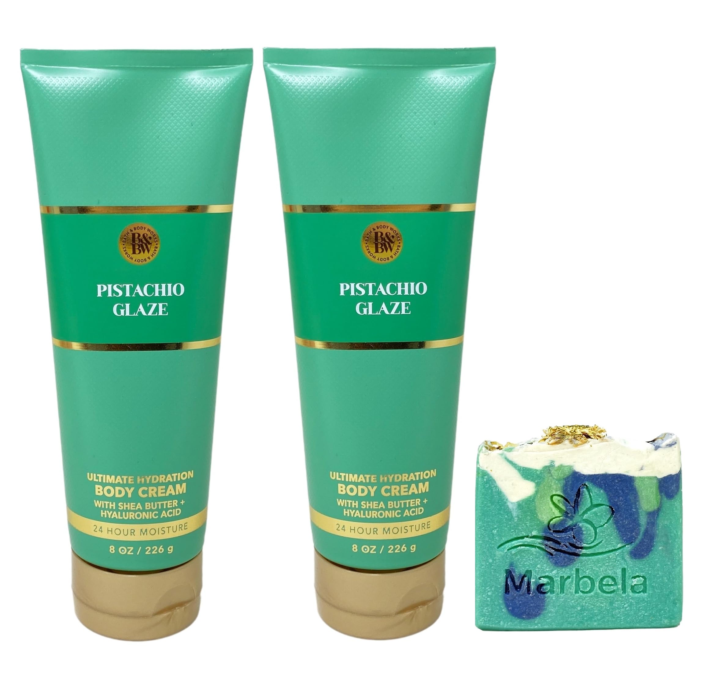 Marbela Aloe Vera Bar Soap - If your skin has been craving moisture, this soap is for you. It's hard to find time to treat your skin with extra care. Adding aloe vera soap to your routine is an easy way to add a new level of care for your body because of aloe vera's natural benefits. Pistachio Glaze - What it smells like: a specialty bakery confection you can't help but crave. Fragrance notes: pistachio crème, toasted vanilla and sugared patchouli. 2 Ultimate Hydration Body Creams (8 oz 226 g each) - What it does: provides intense hydration to relieve dry skin for 24-hour moisture. Bath Body Works Pistachio Glaze 2 Pack Body Cream Bundle with a 4 oz Marbela Aloe Vera Bar Soap (Soap May Vary).