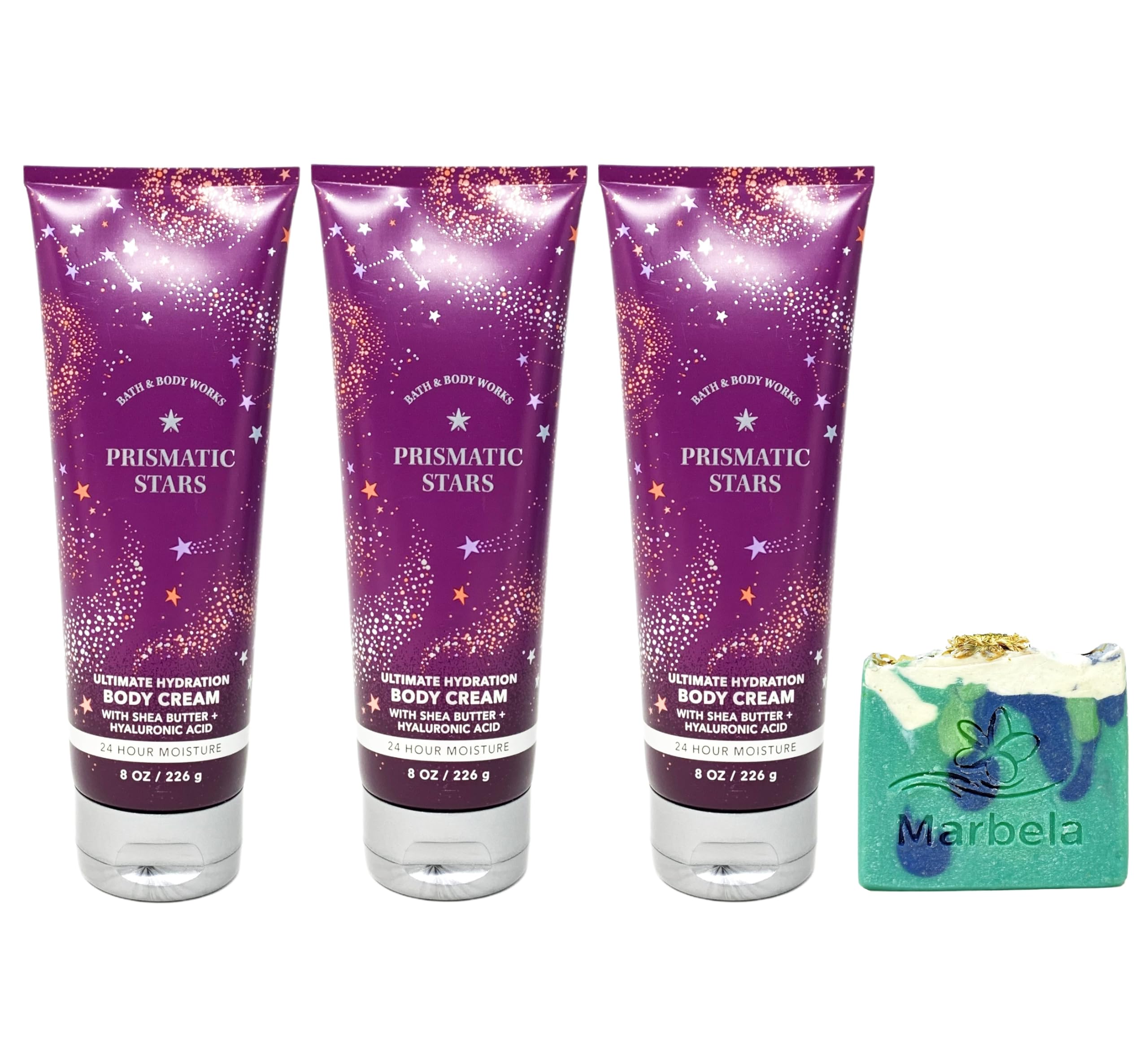 Marbela Aloe Vera - If your skin has been craving moisture, this soap is for you. It's hard to find time to treat your skin with extra care. Adding aloe vera soap to your routine is an easy way to add a new level of care for your body because of aloe vera's natural benefits. Whether you're treating sunburns, eczema, allergic reactions, bumps, or just dry skin, be sure to try this. Prismatic Stars - What it smells like: looking up at the sweet, shimmering stars on a warm night. Fragrance notes: raspberry stardust, mystic plum and cosmic cashmere. 3 Ultimate Hydration Body Creams (8 oz 226 g each) - What it does: provides intense hydration to relieve dry skin for 24-hour moisture. Infused with the good stuff (natural essential oils, vitamin E, aloe, shea butter, cocoa butter and hyaluronic acid). Bath Body Works Prismatic Stars Body Cream Bundle with a 4 oz Marbela Aloe Vera Bar Soap (Soap May Vary).