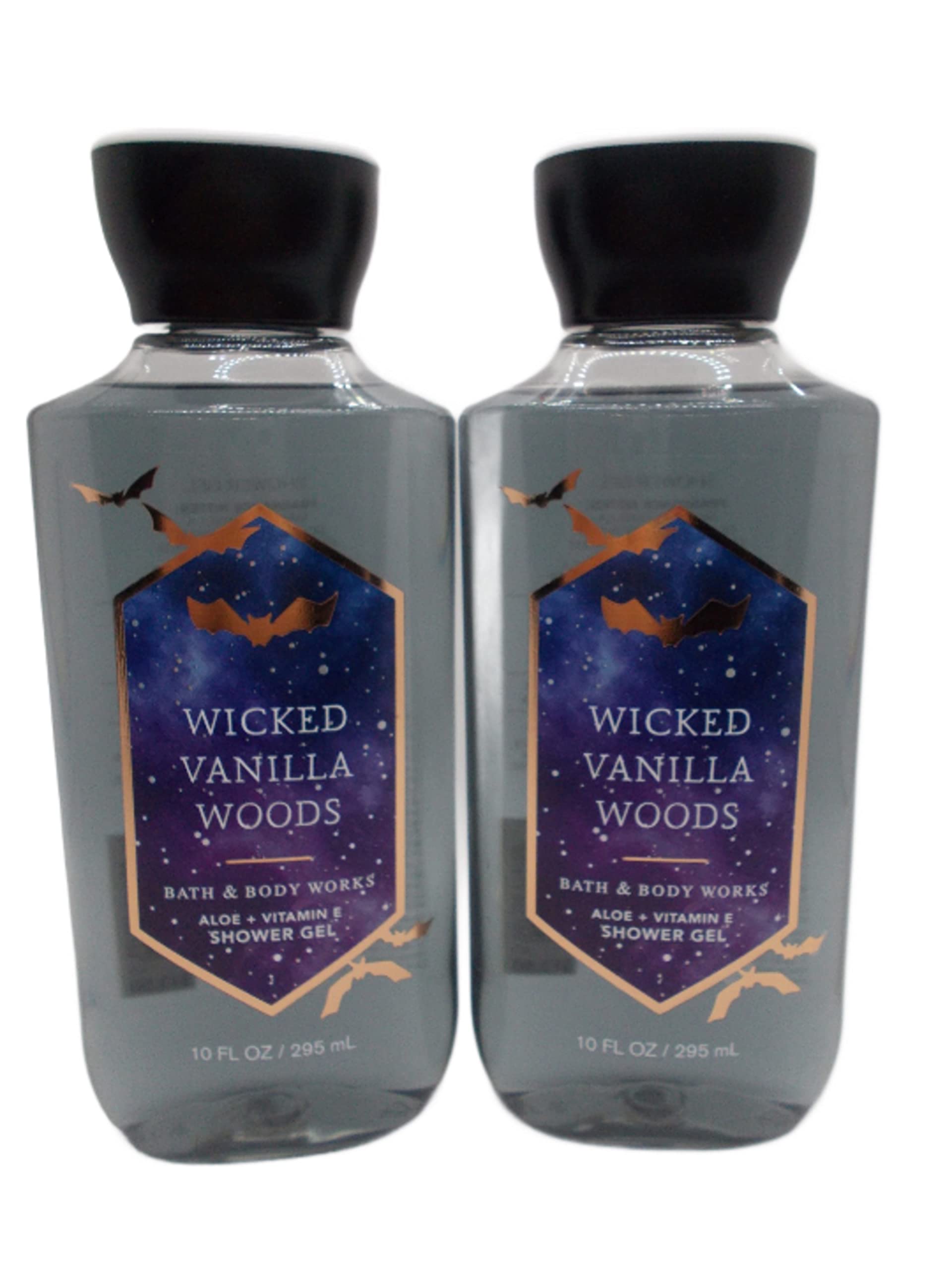 Bath and Body Works Wicked Vanilla Woods 2-pack set Body Wash Gel Contains Pro Vitamin B5 and Aloe. Provides a luxuriously rich lather .Leaves skin feeling irresistibly soft and beautifully fragranced. 10 ounce size each bottle. Fragrance notes: magical vanilla, glowing amberwood and enchanted pink pepper. (Bottle Artwork Color May Vary as Seasonally Refreshed by Manufactuer).