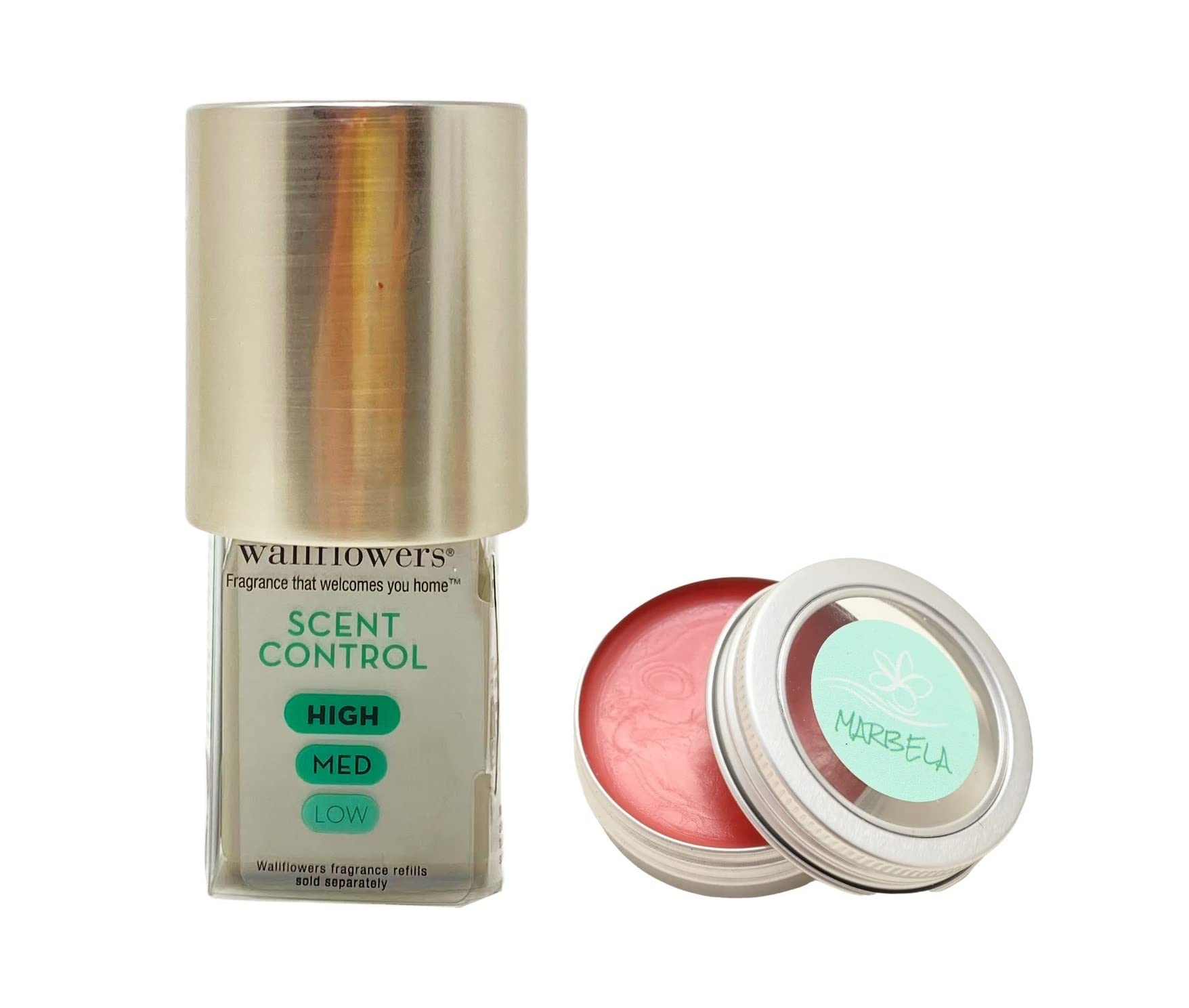 Bath Body Works Silver Metallic Wallflowers Scent Control Fragrance Plug and a Marbela Strawberry Lip Balm. What it does: wafts your favorite, always-on fragrance into any room and brightens it up at the same time. Totally adjustable with 3 intensity levels to fit every room. Provides about more than 1 month of fragrance on low, 1 month on medium (default setting) and less than 1 month on high. Perfect for every (and any) room. Pairs with your favorite Wallflowers fragrance refills (sold separately). Marbela Strawberry Lip Balm - Notes of: Strawberry. Pucker up, baby! Marbela's natural lip balm is your go to for healing chapped lips that need a buttery treatment. And who can avoid delicious strawberry scented lips? The balm oil can also be used to moisturize dry areas, like elbows or cuticles.