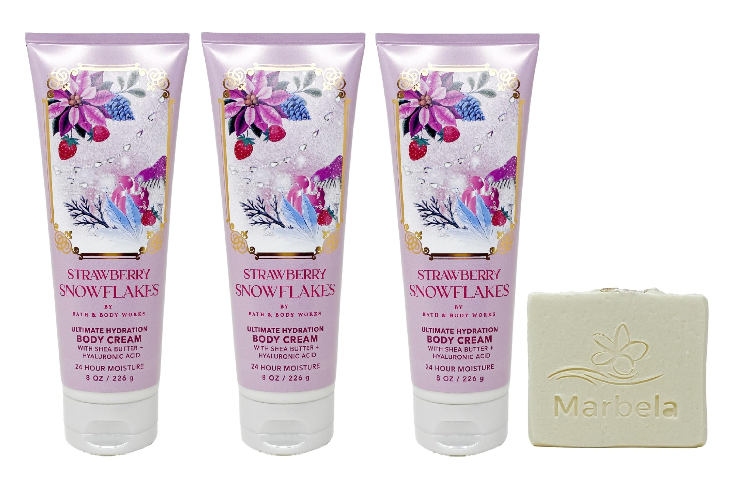 Bath Body Works Strawberry Snowflakes - 3 Ultimate Hydration Body Cream - with a Natural Oats Soap (Ingredients:Saponified Oils of: Olive Oil, Organic Virgin Coconut Oil, Shea Butter, Sweet Almond Oil, Castor Oil, Vitamin E, Oats, Titanium Dioxide).