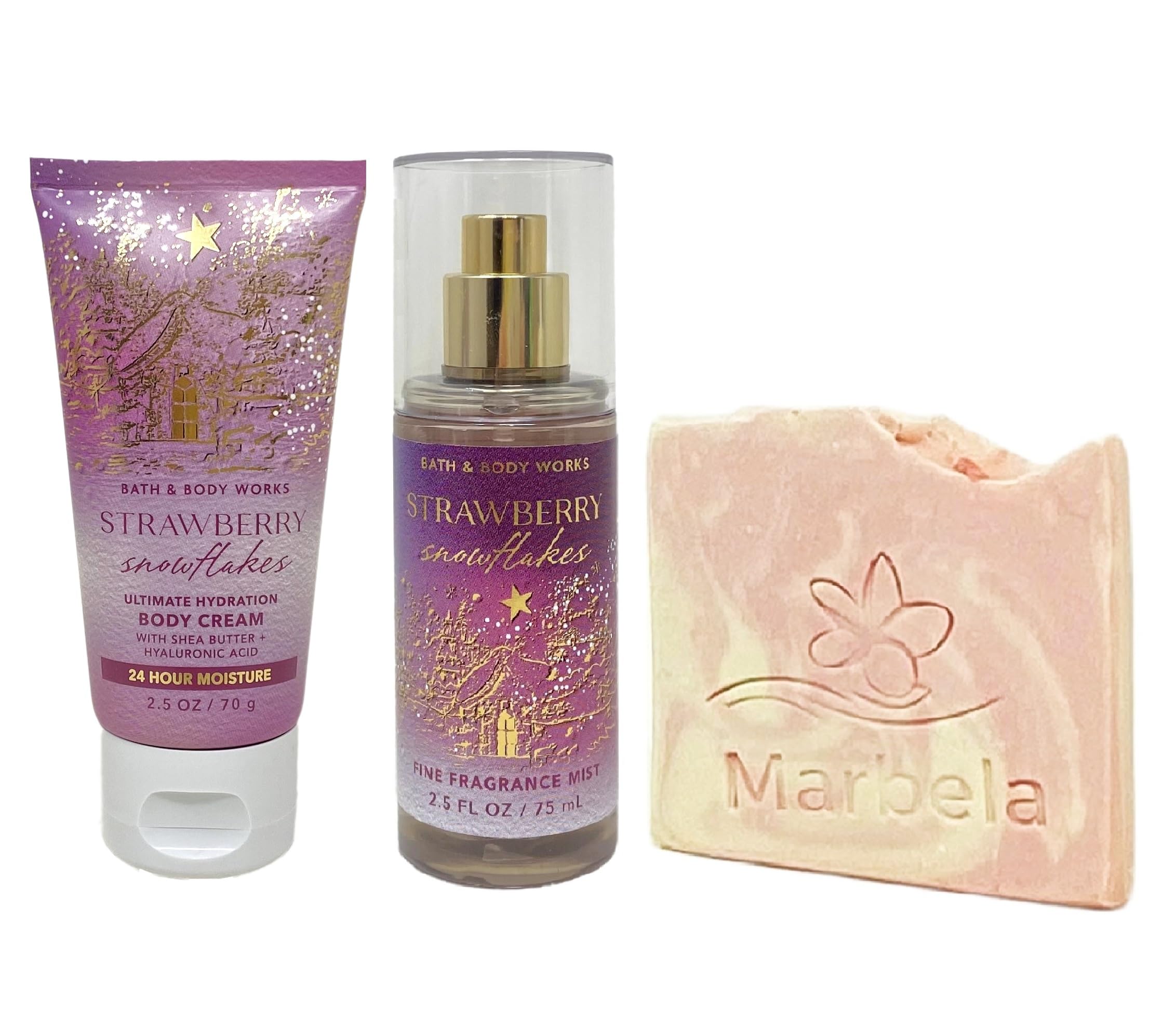 Marbela Sample Soap - While ordinary soaps dry out your skin, Marbela specializes in all-natural, moisturizing soaps and bath products that will take your self-care routine to the next level. The priority is to create products that are all-natural, vegan, cruelty-free and most importantly, handmade with love. Strawberry Snowflakes - What it smells like: a fluffy, fruity flurry. Fragrance notes: juicy strawberry, whipped cream and iced bergamot. Travel Size Fine Fragrance Mist (2.5 fl oz 75 mL) - What it does: scents your skin with a mist that's super layerable. Travel Size Ultimate Hydration Body Cream (2.5 oz 70 g) - What it does: provides intense hydration to relieve dry skin for 24-hour moisture. Infused with the good stuff (natural essential oils, vitamin E, aloe, shea butter, cocoa butter and hyaluronic acid). Bath Body Works Strawberry Snowflakes Mini Bundle with a Marbela Himalyan Salts Springs Sample Soap. (Soap May Vary).