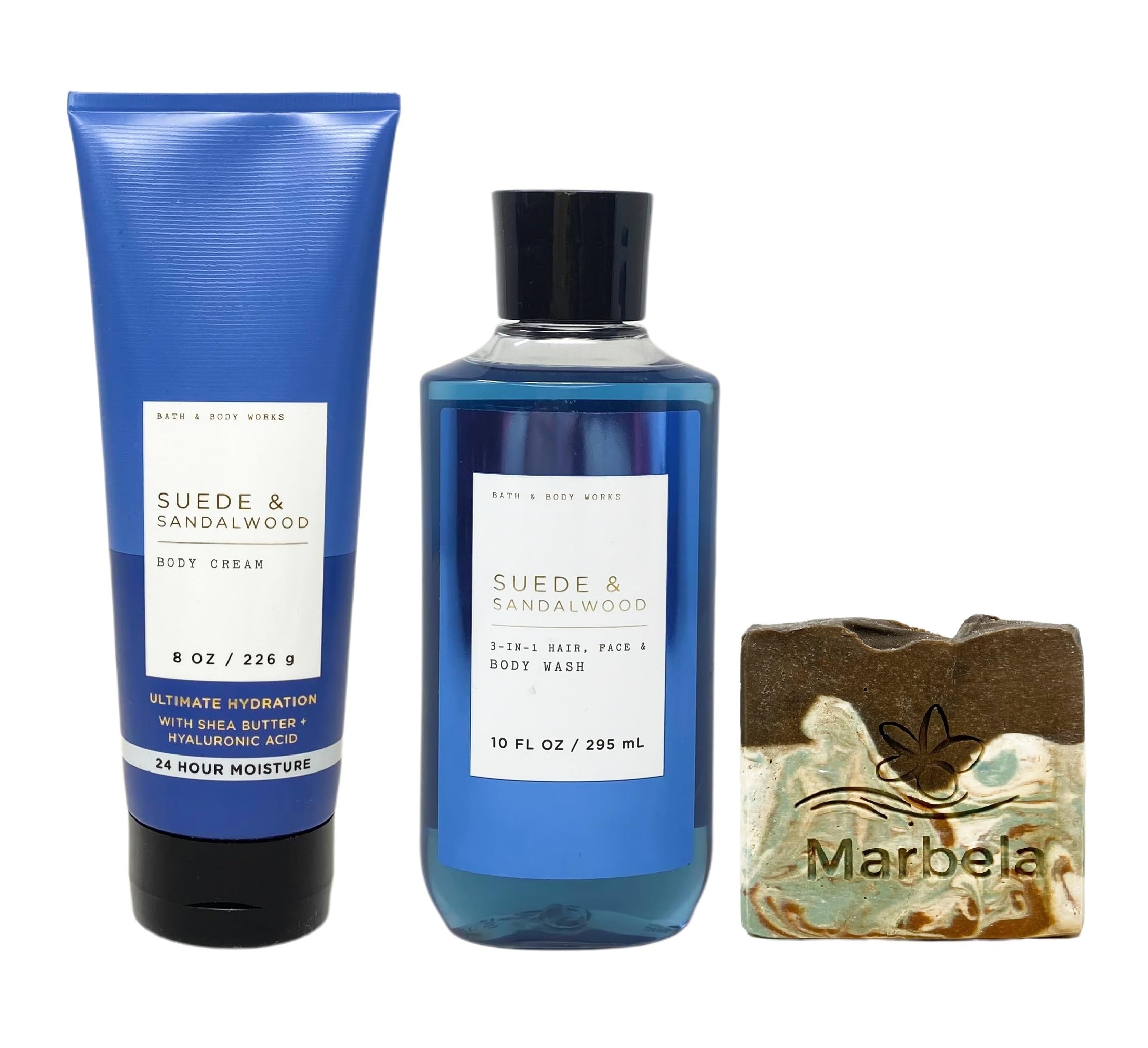 Bath Body Works Suede Sandalwood 2 Piece Bundle with a Marbela Cabin Spice Bar Soap. INCLUDES: 8 oz 226 g Ultimate Hydration Body Cream, 10 fl oz 295 mL 3-in-1 Hair, Face Body Wash, and a 4 oz Marbela Cabin Spice Bar Soap. Suede Sandalwood - What it smells like: woodsy with a hint of creaminess—inspired by soft, musky suede and smooth sandalwood. Marbela Cabin Spice Bar Soap - Imagine being cozied up next to a bonfire, cooking over the fire, and smelling the smoke all through the air. There are few things that feel quite like fall in the same way a bonfire does. Cabin Spice is the perfect warm scent to last from early fall all the way through the winter. Notes of: Tobacco, Patchouli, Bay Mad.