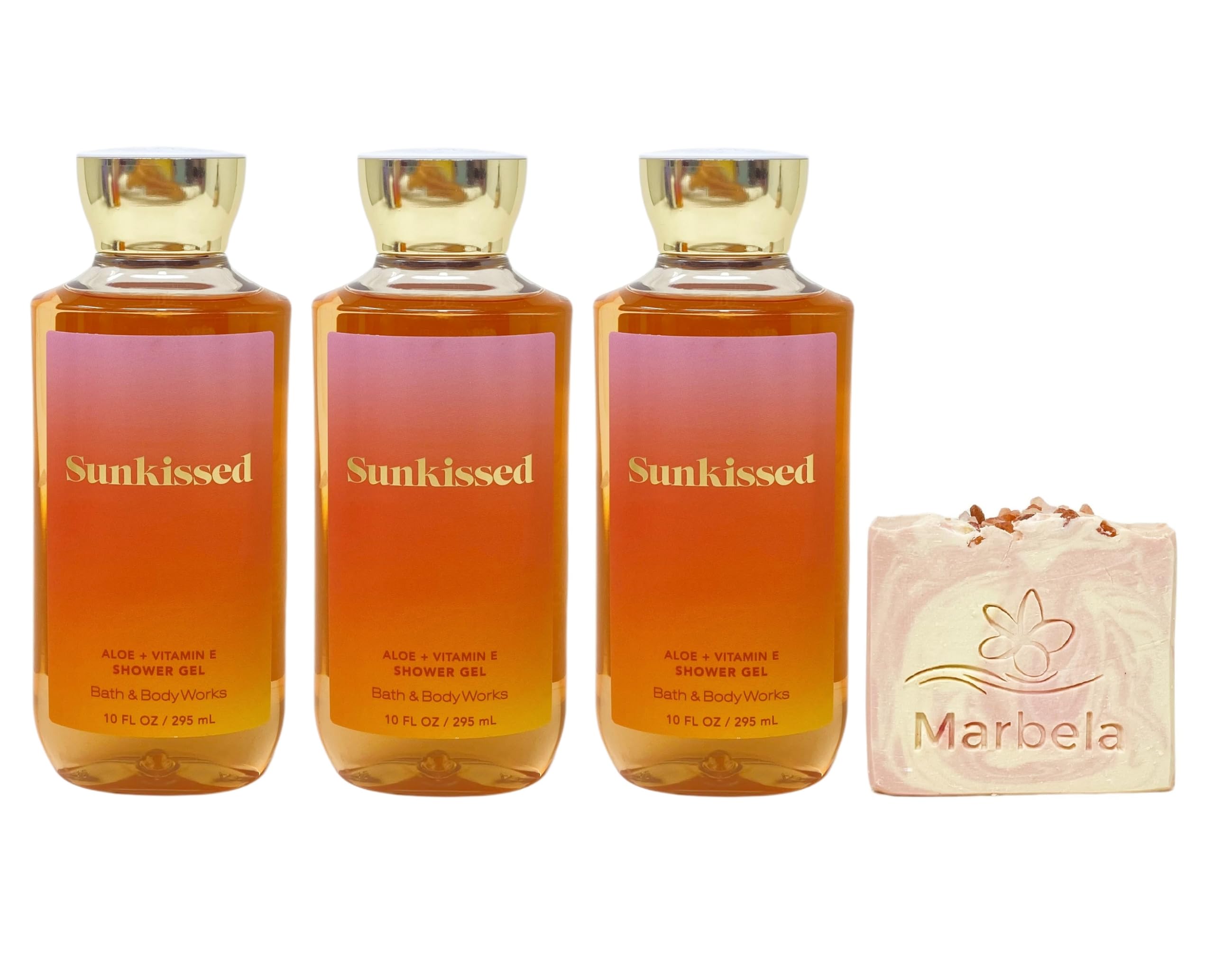 Marbela Himalayan Salts Springs Soap - Himalayan salts help hydrate and nourish the skin, with its water absorbent properties. These minerals are known to be helpful for acne, irritated and dry skin. Himalayan Salt Springs soap has natural kaolin clay blended to further moisturize and hydrate your body. Sunkissed - What it smells like: a warm, sweet beach escape. Fragrance notes: sun-drenched orange blossom, sparkling sea salt and vanilla breeze. 3 Aloe Vitamin E Shower gel (10 fl oz 295 ml each) - What it does: leaves your skin feeling fresh, clean and beautifully fragranced. Bath Body Works Sunkissed Shower Gel with a 4 oz Marbela Himalayan Salts Springs Soap. (Soap May Vary).