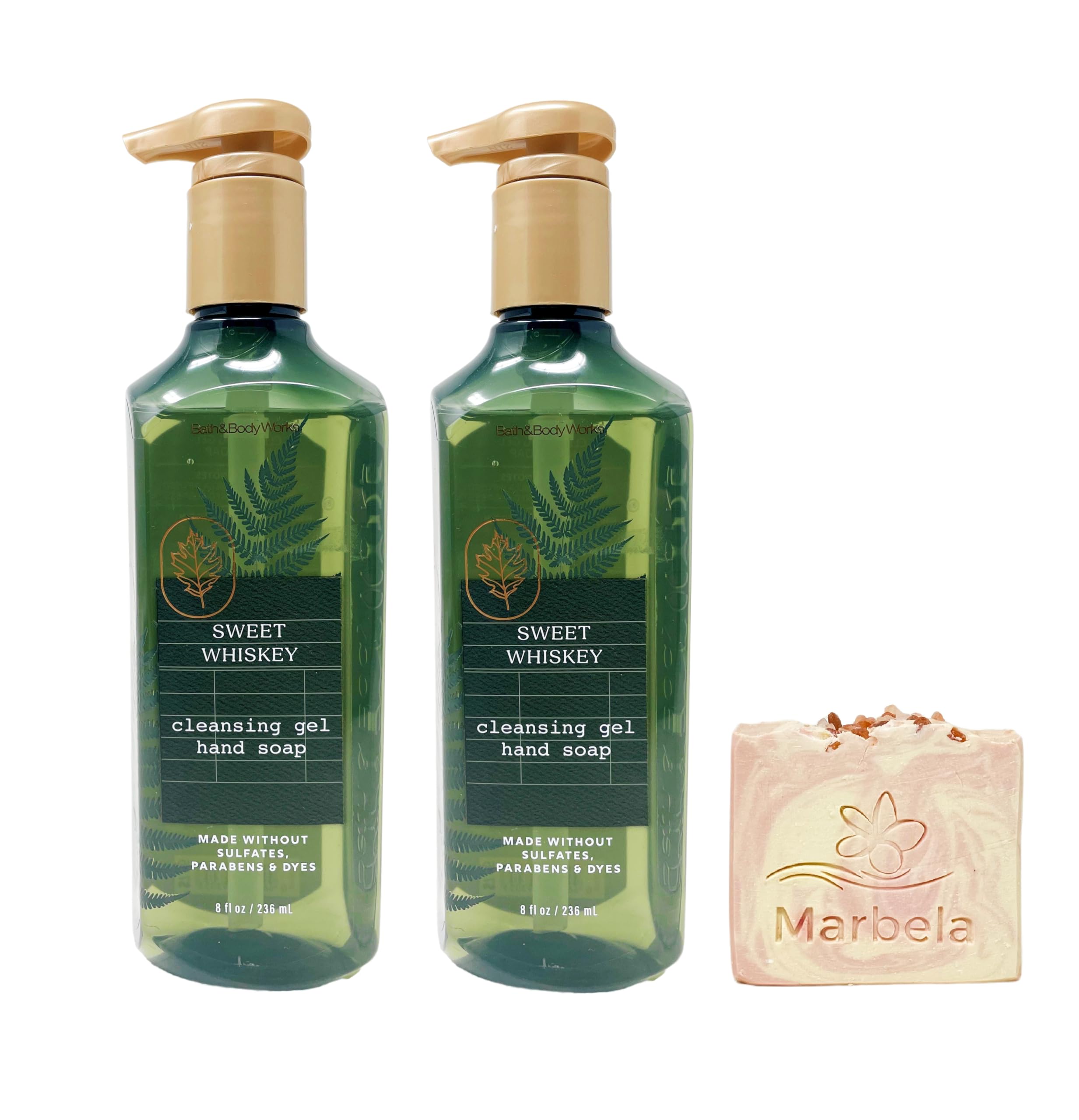 Bath Body Works Sweet Whiskey Cleansing Gel Hand Soap Bundle and a Marbela Himalayan Salts Springs Bar Soap. INCLUDES: 2 Cleansing Gel Hand Soaps (8 fl oz 236 mL each) and a 4 oz Marbela Himalayan Salts Springs Bar Soap. Sweet Whiskey - What it smells like: a sweet, adventurous spirit with a fruity finish. Fragrance notes: golden amber, vanilla-infused whiskey and sweet red berries. What it does: washes away dirt, leaving your hands feeling clean and soft. Marbela Himalayan Salts Springs Bar Soap - Himalayan salts help hydrate and nourish the skin, with its water absorbent properties. These minerals are known to be helpful for acne, irritated and dry skin. Himalayan Salt Springs soap has natural kaolin clay blended to further moisturize and hydrate your body. Scent: Citrusy Florals with Litsea Cubeba Essential Oil. Ingredients: Saponified Oils of: Olive Oil, Organic Virgin Coconut Oil, Shea Butter, Castor Oil, Himalayan Salts, Kaolin Clay, Fragrance, Vitamin E, Mica, Litsea Cubeba Essential Oil
