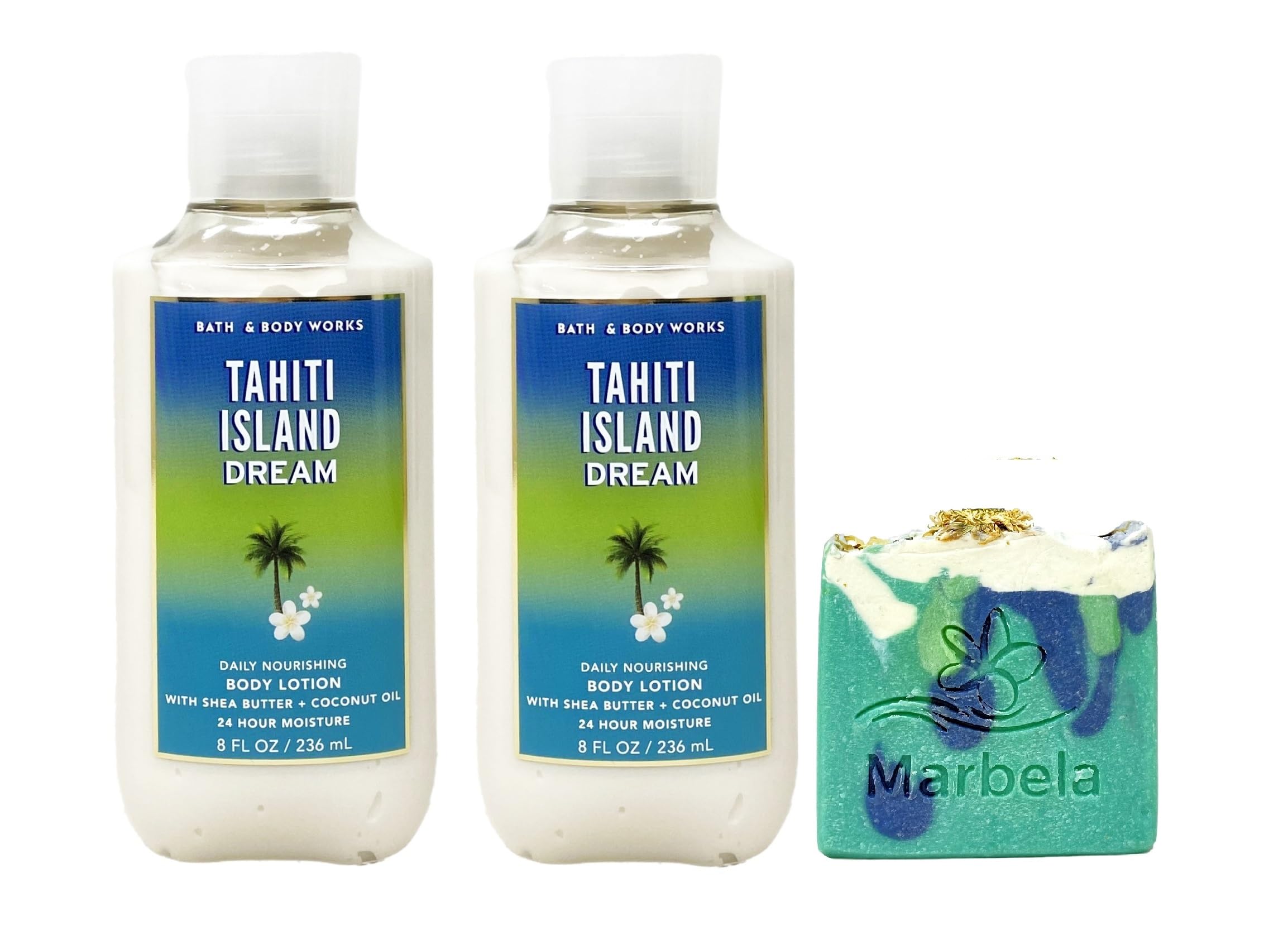 Bath Body Works Tahiti Island Dream Daily Nourishing Body Lotion Bundle with a Marbela Aloe Vera Bar Soap. INCLUDES: 2 Daily Nourishing Body Lotions (8 fl oz 236 mL each) and a 4 oz Marbela Sea Breeze Bar Soap. Tahiti Island Dream - What it smells like: being whisked away on a surprise island vacay. Fragrance notes: fresh coconut water, sparkling mandarin, kiwi blossom, lush frangipani and Tahitian vanilla musk.
