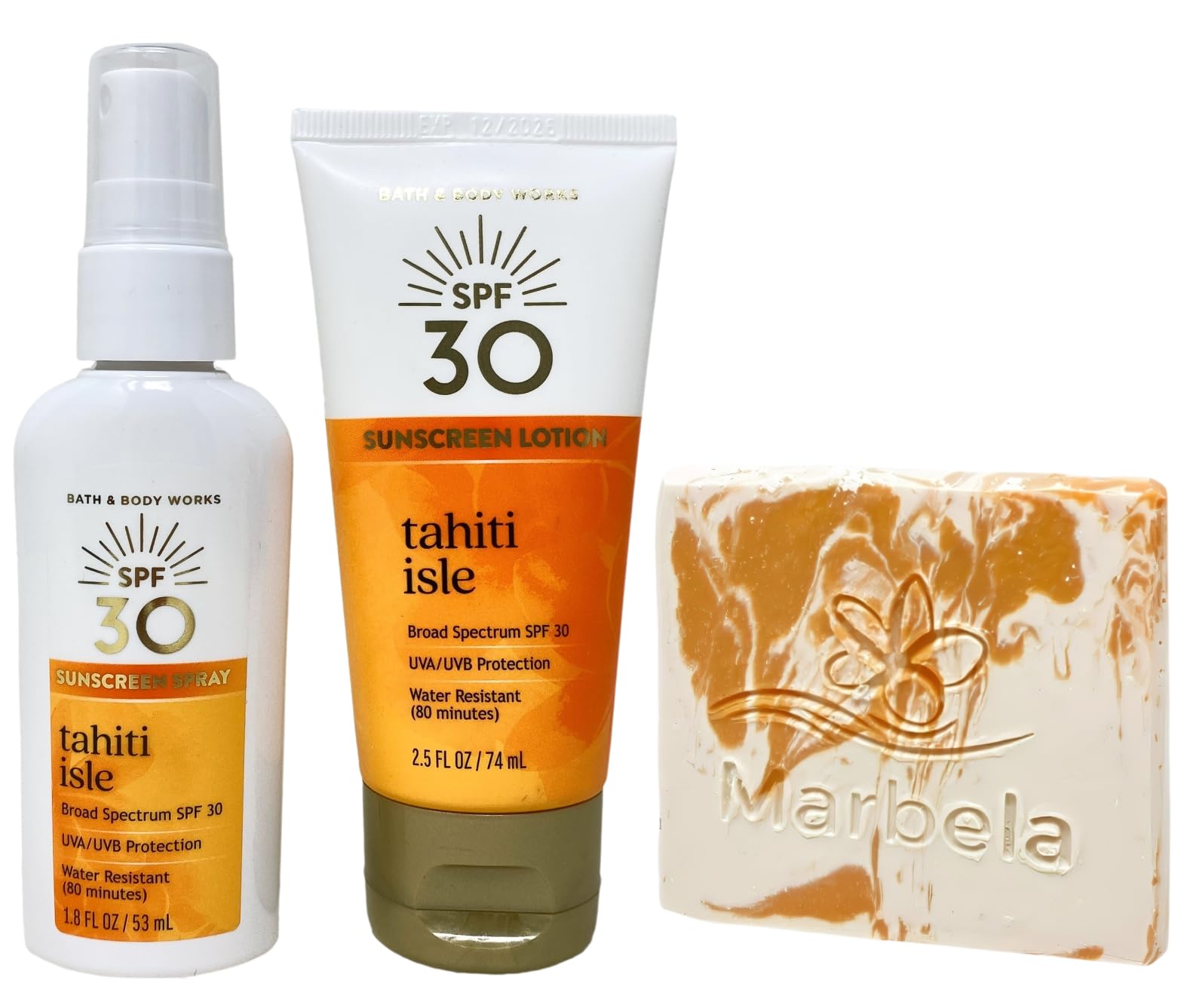 Bath Body Works Tahiti Isle SPF 30 Sunscreen Lotion and Sunscreen Spray Travel Size with a Peach Gardenia Sample Soap (Ingredients: Saponified Oils of: Olive Oil, Organic Virgin Coconut Oil, Shea Butter, Castor Oil, Fragrance, Mica, Vitamin E).