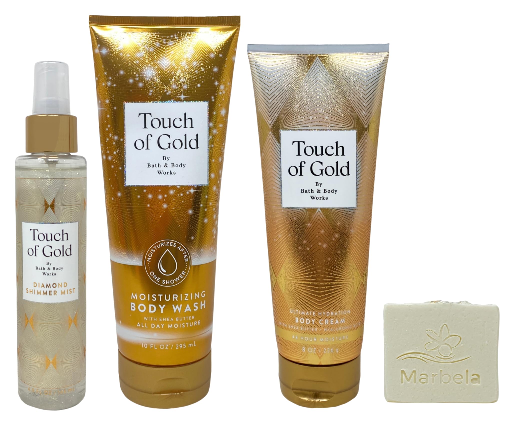 Bath Body Works Touch of Gold Diamond Shimmer Mist, Moisturizing Body Wash and Ultimate Hydration Body Cream with a Natural Oats Bar (Ingredients Soap Saponified Oils of: Olive Oil, Organic Virgin Coconut Oil, Shea Butter, Sweet Almond Oil, Castor Oil, Vitamin E, Oats, Titanium Dioxide).