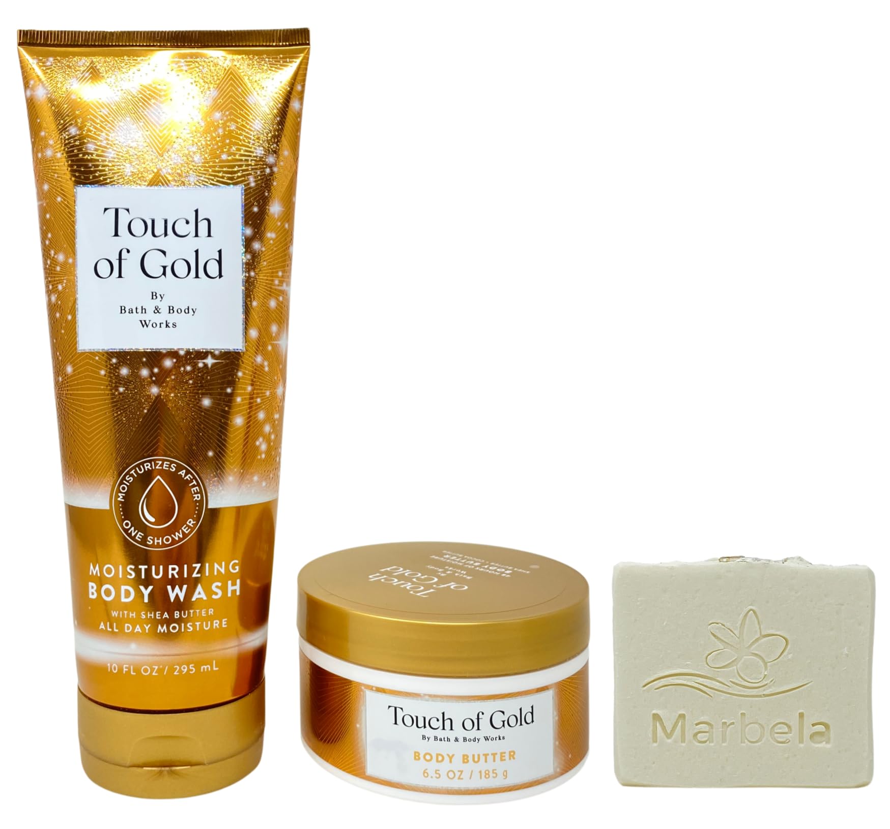 Bath Body Works Touch of Gold Moisturizing Body Wash and Body Butter with a Natural Oats Bar (Ingredients Soap Saponified Oils of: Olive Oil, Organic Virgin Coconut Oil, Shea Butter, Sweet Almond Oil, Castor Oil, Vitamin E, Oats, Titanium Dioxide).