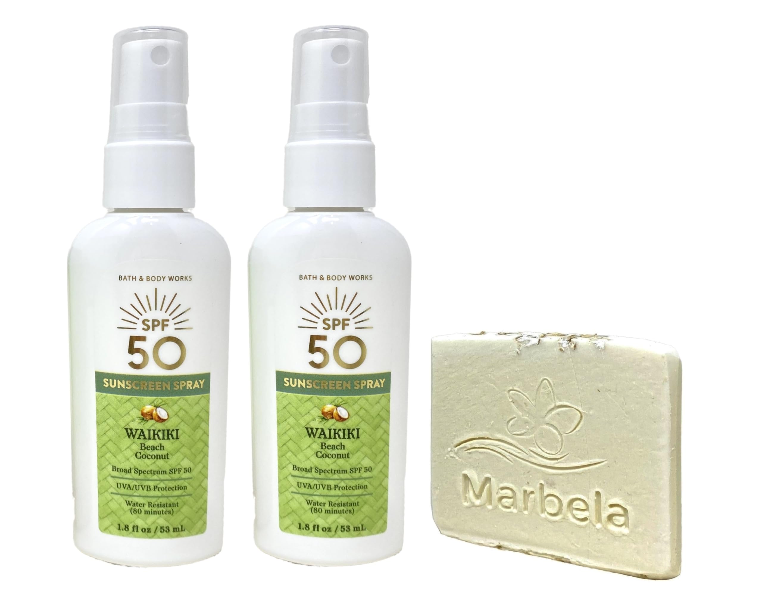 Marbela Natural Oats Sample Soap - Natural Oats is our most gentle formula for any skin type! Oats help to cleanse, exfoliate and soothe irritation. In addition, the sweet almond oil leaves skin soft and pampered. This soap was made for people with sensitive skin because we realize what a battle that can be. Waikiki Beach Coconut - What it smells like: a sweet, sunny beach vacay. Fragrance notes: tropical white coconut, saltwater breezes and sun-bleached woods. 2 Travel Size SPF 50 Sunscreen Spray (1.8 fl oz 53 mL each ) - provides your skin with broad spectrum (UVA UVB) protection and 24 hours of moisturization. Water resistant for 80 minutes. Bath Body Works Waikiki Beach Coconut with a Marbela Natural Oats Sample Soap. (Soap May Vary).