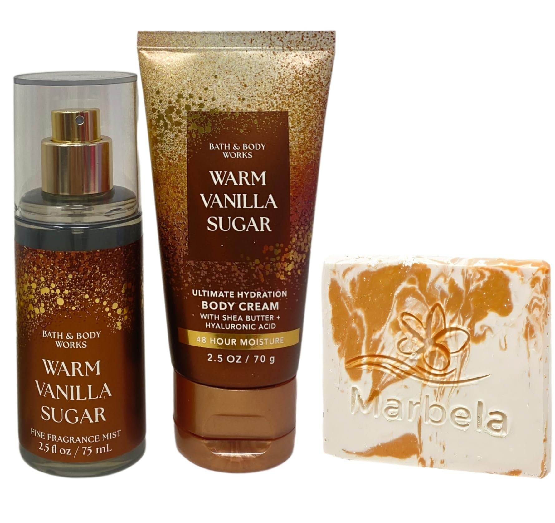 Bath Body Works Warm Vanilla Sugar - Fine Fragrance Mist - Ultimate Hydration Body Cream - with a Peach Gardenia Sample Soap - Travel Size ( Ingredients: Saponified Oils of: Olive Oil, Organic Virgin Coconut Oil, Shea Butter, Castor Oil, Fragrance, Mica, Vitamin E).