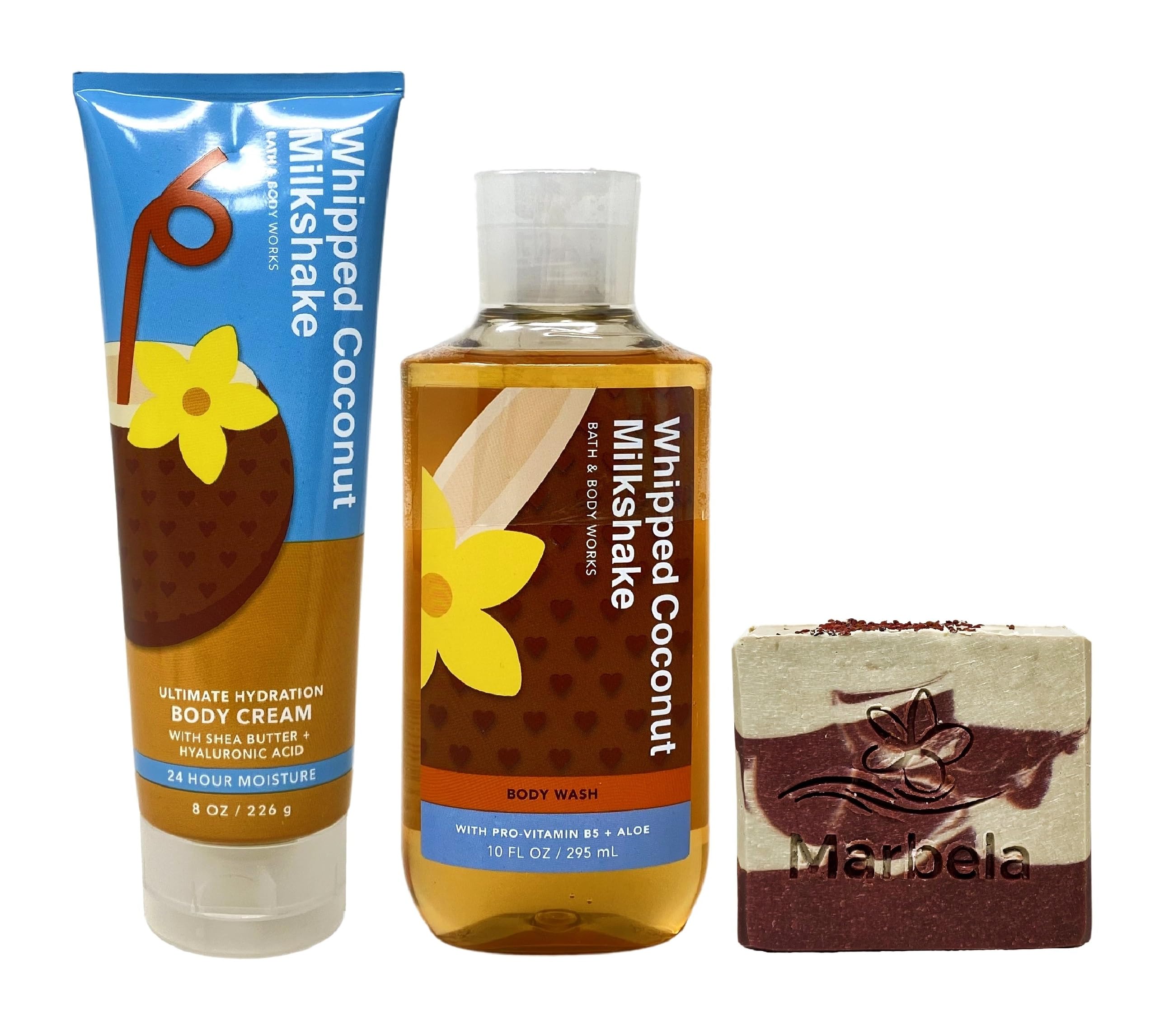 Bath Body Works Whipped Coconut Milkshake 2 Piece Bundle with a Marbela Cherry On Top Bar Soap. INCLUDES: 8 oz 226 g Ultimate Hydration Body Cream, 10 fl oz 295 mL Body Wash, and a 4 oz Marbela Cherry On Top Bar Soap. Whipped Coconut Milkshake - What it smells like: a tropical twist on everyone's favourite diner dessert. Fragrance notes: vanilla ice cream, toasted coconut and sugared amber. Marbela Himalayan Salts Springs Bar Soap - Himalayan salts help hydrate and nourish the skin, with its water absorbent properties. These minerals are known to be helpful for acne, irritated and dry skin. Himalayan Salt Springs soap has natural kaolin clay blended to further moisturize and hydrate your body. Scent: Citrusy Florals with Litsea Cubeba Essential Oil.