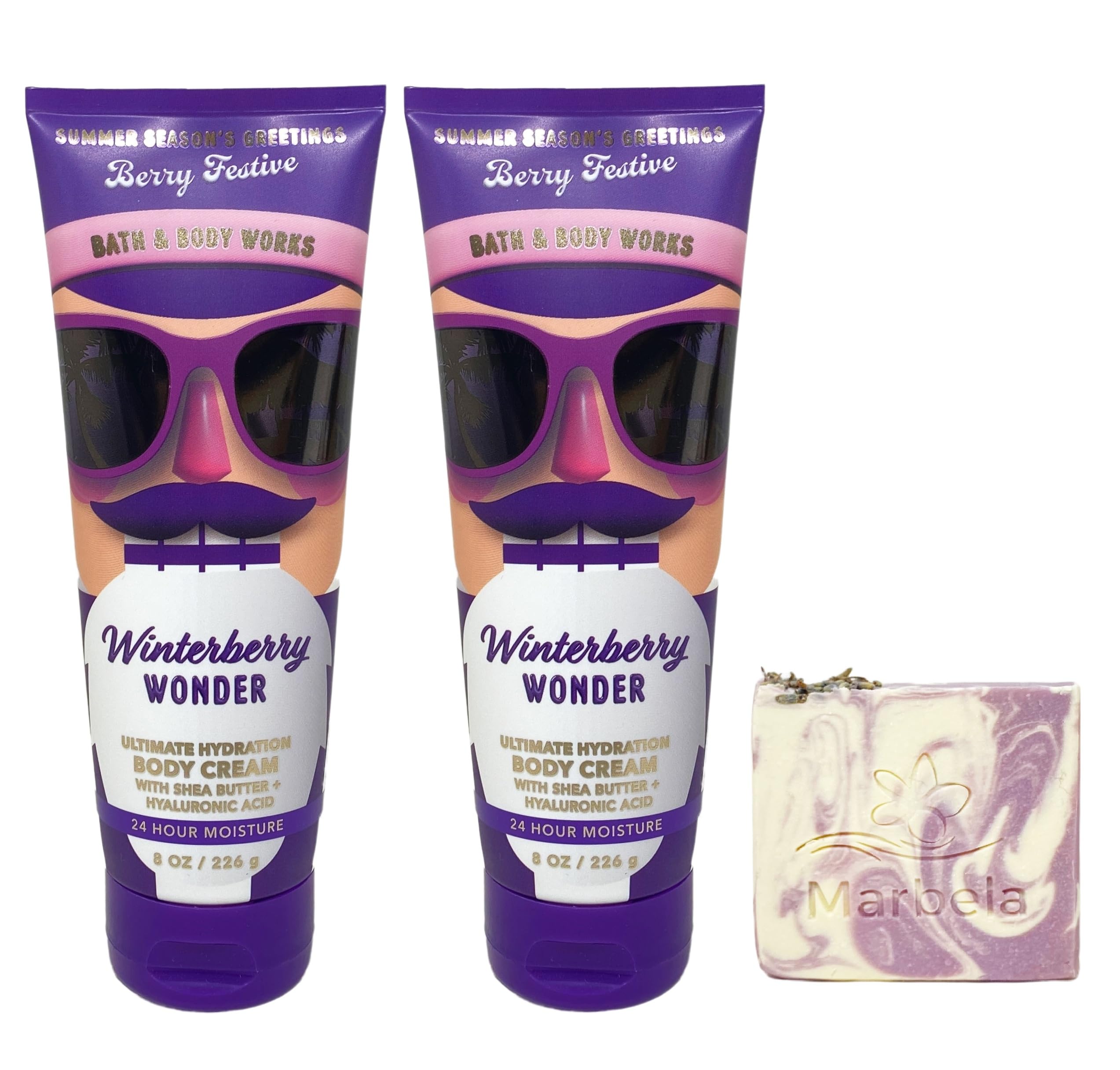 Bath Body Works Winterberry Wonder 2 Pack Body Cream Bundle with a 4 oz Marbela Lavender Dream Bar Soap (Ingredients: Saponified Oils of: Olive Oil, Organic Virgin Coconut Oil, Cocoa Butter, Shea Butter, Castor Oil, Sweet Almond Oil, Dried Lavender, Fragrance, Vitamin E, Kaolin Clay, Sodium Lactate, Mica Essential oils of Cedarwood Atlas, Lavender, and Orange).