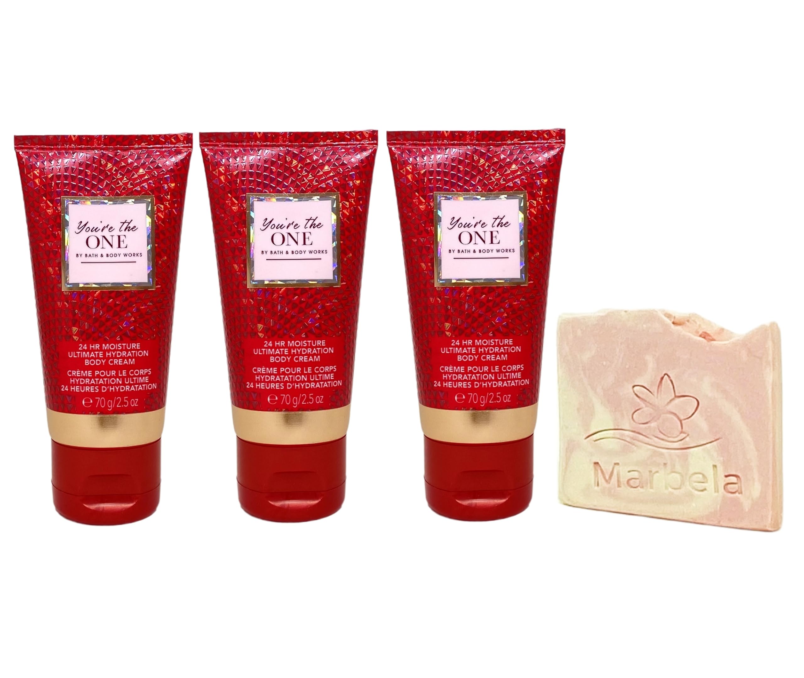 Marbela Sample Soap - While ordinary soaps dry out your skin, Marbela specializes in all-natural, moisturizing soaps and bath products that will take your self-care routine to the next level. The priority is to create products that are all-natural, vegan, cruelty-free and most importantly, handmade with love. You're The One - What it smells like: a sparkling, beautiful night with the one you love. Fragrance notes: white birch, velvety rose and a drop of strawberry nectar. 3 Travel size Ultimate Hydration Body Creams (2.5 oz 70 g each) - What it does: provides intense hydration to relieve dry skin for 24-hour moisture. Bath Body Works You're The One Mini Body Cream Bundle with a Marbela Himalayan Salts Springs Bar Soap. (Soap May Vary).
