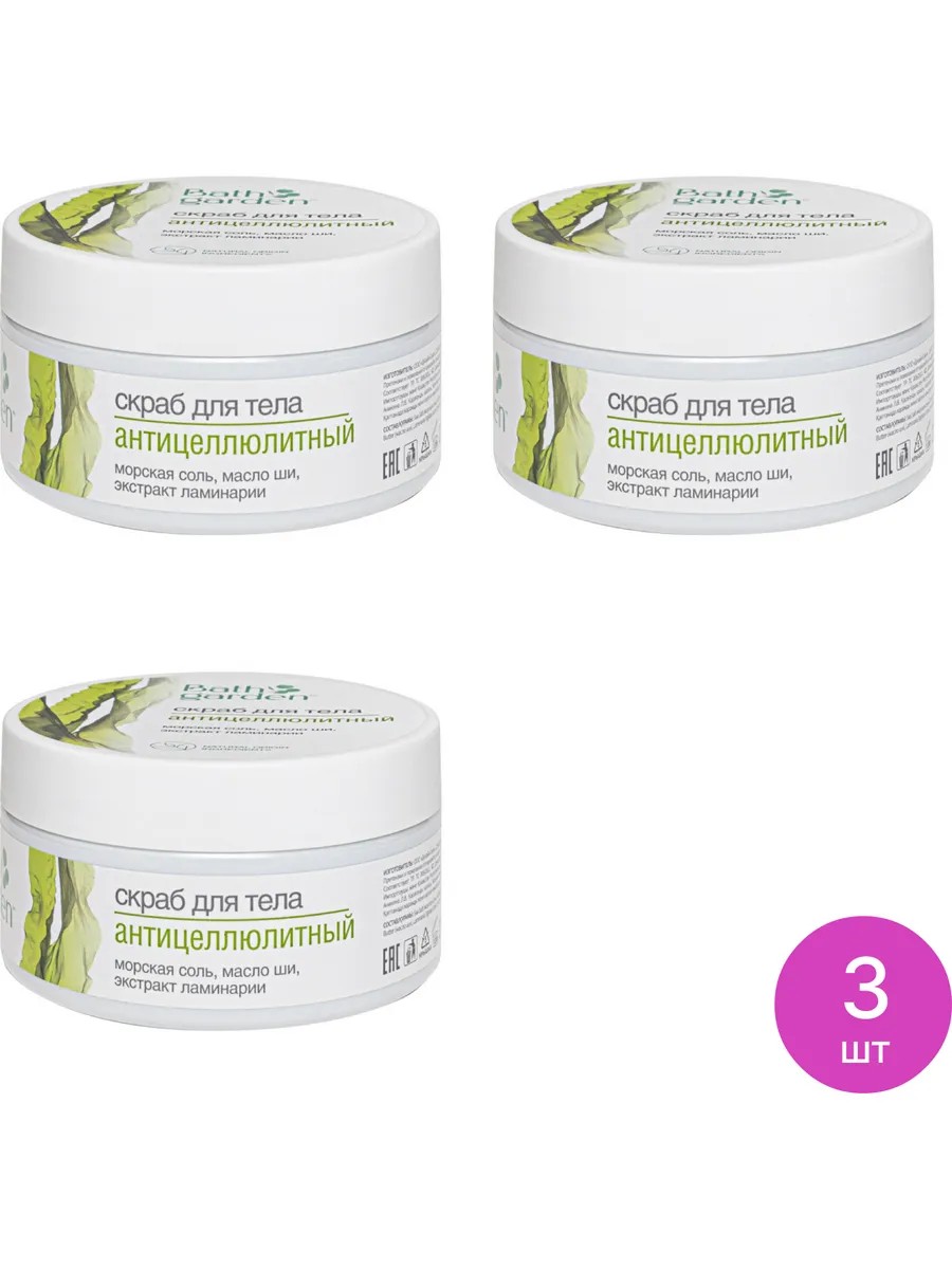Bath Garden Anti-Cellulite Body Scrub with Sea Salt, Shea Butter, and Laminaria Extract, 270g / peeling. Set of 3. Price per set. Bath Garden's natural anti-cellulite body scrub tones and firms skin. This effective skin care product contains over 99% natural ingredients and gently exfoliates and cleanses the skin. The sea salt-based Anti-Cellulite Body Scrub gently exfoliates, smooths out microrelief, nourishes, softens, and restores skin, leaving it firm and elastic. Regular use leaves skin soft, smooth, and velvety. Sea salt saturates the skin with essential minerals and trace elements, stimulates cell renewal, and improves firmness and elasticity. Shea butter nourishes and restores, softens, moisturizes, and protects the skin. Laminaria extract prevents cellulite, promotes lymphatic drainage, and removes toxins and excess fluid. The aroma of a natural body scrub with notes of sea salt and shea butter leaves your skin exquisitely scented and smooth all day long! This body scrub with oils contains: Sea Salt, Sodium Chloride, Glycerin, Aqua, Helianthus Annuus Seed Oil, Polysorbate 20, Butyrospermum Parkii Butter, Laminaria Digitata Extract, Laminaria Digitata Powder, Tocopheryl Acetate, Xanthan Gum, and Parfum. Dry body scrub / body scrubs / natural body scrub.