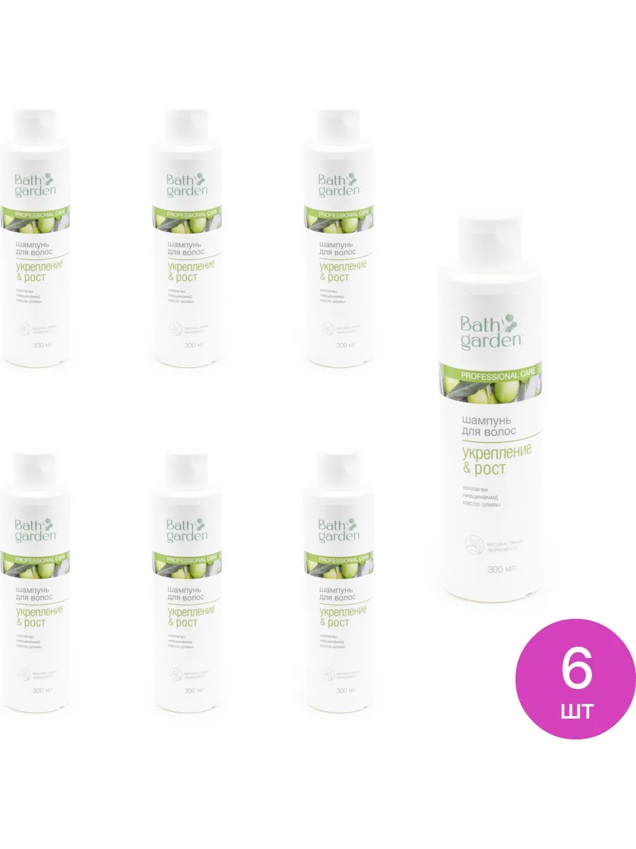 Bath Garden / Bath Garden Women's Strengthening & Growth Shampoo with Collagen, Niacinamide, and Olive Oil for All Hair Types 300ml / Cosmetics. Set of 6. Price per set. Bath Garden women's liquid shampoo, thanks to its natural ingredients, cares for, strengthens, and nourishes hair, leaving it looking well-groomed and healthy. Collagen strengthens the hair structure, reduces breakage and prevents split ends, and increases firmness and elasticity. Niacinamide strengthens and restores hair structure, promotes growth, and reduces hair loss. Olive oil moisturizes and nourishes hair, leaving it soft and silky. The result of Bath Garden shampoo: shiny, thick, healthy hair with an incredible scent! Shampoo for hair shine / professional hair shampoo / shampoo for oily hair Ingredients: Aqua, Sodium Laureth Sulfate, Sodium Chloride, Cocamidopropyl Betaine, Glycerin, Niacinamide, Olea Europaea Fruit Oil, Desamido Collagen, Disodium Cocoamphodiacetate, Sodium Hyaluronate, Guar Hydroxypropyltrimonium Chloride, Citric Acid, Benzyl Alcohol, Sodium Benzoate, Potassium Sorbate, Parfum, Hexyl Cinnamal.