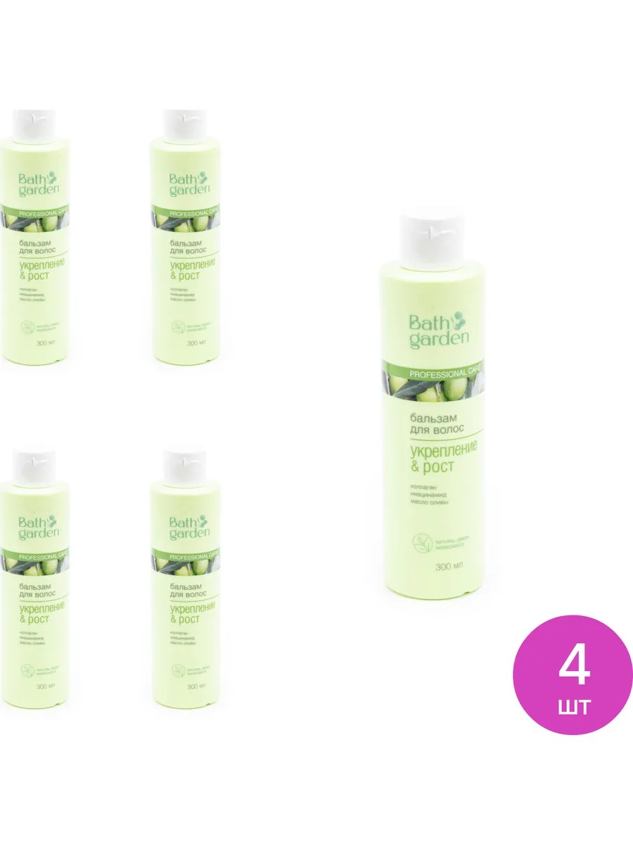 Bath Garden / Bath Garden Strengthening & Growth Hair Balm with Collagen, Niacinamide, and Olive Oil 300ml / Hair Care. Set of 4 pcs. Price per set. Restoration and hydration are essential not only for our body but also for our hair. Healthy hair is an indicator of our body's health. Bath Garden hair balm effectively cares for hair along its entire length, restores its structure, prevents breakage and hair loss, and makes combing and styling easier. This hair care product contains natural ingredients. Collagen strengthens the hair structure, reduces breakage and prevents split ends, and increases hair firmness and elasticity. Niacinamide strengthens and restores hair structure, promotes growth, and reduces hair loss. Olive oil moisturizes and nourishes hair, making it soft and silky. Take care of the health of your hair with a balm from Bath Garden! Professional hair balm / hair care / women's hair balm Ingredients: Aqua, Cetearyl Alcohol, Cocos Nucifera Oil, Olea Europaea Fruit Oil, Cetrimonium Chloride, Niacinamide, Glyceryl Stearate, Glycerin, Desamido Collagen, Sodium Hyaluronate, Guar Hydroxypropyltrimonium Chloride, Hydroxyethylcellulose, Benzyl Alcohol, Sodium Benzoate, Potassium Sorbate, Parfum, Hexyl Cinnamal.