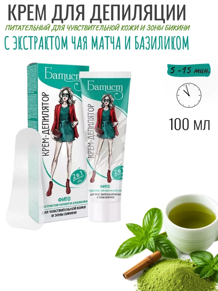 Крем для депиляции Батист предназначен для домашнего экспресс-ухода. С ним вы легко и быстро избавитесь от нежелательных волос в домашних условиях, либо захватив волшебный тюбик с собой в отпуск. Долой бритву! Этот крем депилятор качественно и безболезненно удалит волосы. Новый крем-депилятор ФИТО серии Батист содержит экстракты чая матча и базилика. Чай матча содержит высокую концентрацию мощных натуральных антиоксидантов, которые защищают кожу от негативных воздействий, а базилик – уникальное лекарственное растение, помогающее избежать раздражения и покраснения кожи.