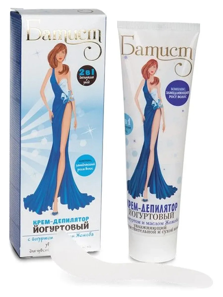 Батист, Крем-депилятор йогуртовый, 100 мл, 1 штука. Батист представляет Йогуртовый крем-депилятор, который содержит активный натуральный комплекс, на основе экстрактов листьев папайи, хмеля и шалфея, замедляющий дальнейший рост волос на длительное время. Крем-депилятор поможет Вам удалить все нежелательные волоски легко, быстро и надолго, при этом даря удовольствие от процесса и результата. Уже через 5 минут после нанесения активные компоненты крема начинают разрушать волосы легко и безболезненно. В состав крема-депилятора входят натуральный йогурт и масло жожоба, которые оказывают увлажняющее и смягчающее действие на кожу.