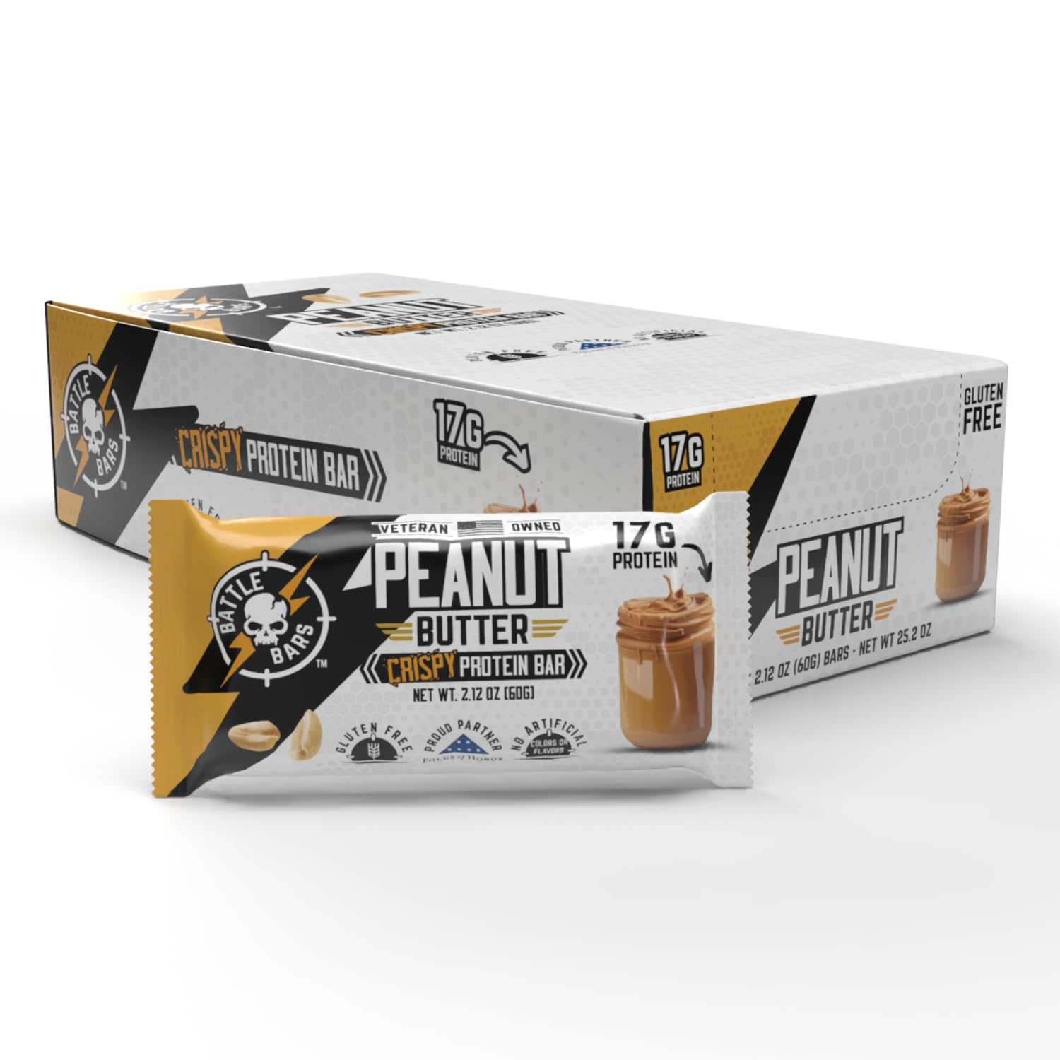 Battle Bars Crispy Protein Bar 17g Protein per Snack Bar - Gluten Free No Artificial Flavors or Colors - Veteran Founded - Peanut Butter (60g) 12 Count Peanut Butter 1 Count (Pack of 12)