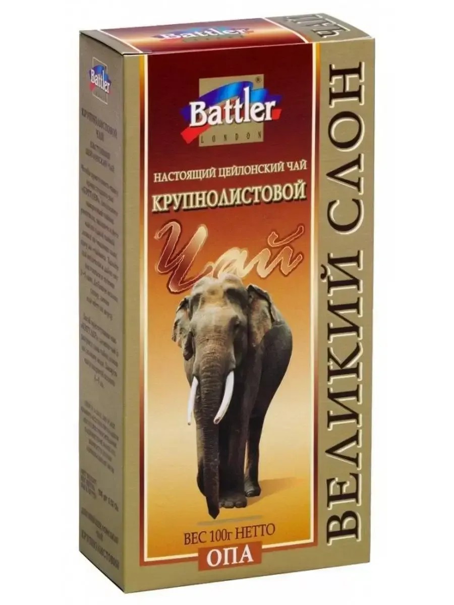Battler, Great Elephant Large Leaf Black Tea, OPA, 100g. This whole-leaf tea produces a soft flavor and light color when brewed. Carefully rolled, the whole leaf is harvested in the foothills of Ceylon. Packed in foil, the tea remains fresh and fragrant.