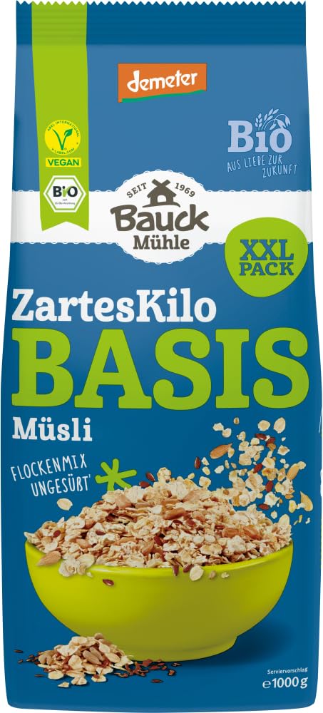 Processing: No genetically modified organisms or raw materials, no preservatives or additives. Residue analysis of each ingredient. German enV vegan certification, EU organic label. INGREDIENTS Whole grain flakes - Soft leaves 83 - Whole barley oats - Whole spelt grains - Flax seeds 17 - Sunflower seeds INSTRUCTIONS Fresh grain cereal: 5 tablespoons of cereal base, 8 tablespoons of water, 1 grated apple, 1 tablespoon of raisins, 1 tablespoon of heavy cream or whipped cream. Mix the cereal base with cold water and refrigerate overnight. The next morning, lift the fresh apple and raisins from under the fresh grain porridge. Finish with heavy cream or whipped cream. Sweeten to taste, if desired. Seeded pancakes: 100g Bauckhof basic cereal, 50g type 1050 spelt flour, 2 eggs, 1 pinch of salt, 250ml milk. Mix the flour, eggs, milk, and salt to obtain a smooth batter. Add the basic cereal and stir. Heat the oil in a frying pan over medium heat. Pour a trowelful of batter into the pan and smooth it out. Cook until golden brown on both sides. SAFETY WARNING Allergy information: Contains: sesame, gluten. Not used in production: eggs, fish, milk, peanuts, soy, celery, mustard, lupin, muslin. See moreBauckhof Bio Basis Müzli Das zarte Kilo Demeter (2 x 1000 g)DESCRIPTION DU PRODUIT DESCRIPTION DU PRODUIT Traitement : sans utilisation d'organismes génétiquement modifiés ou de matières premières génétiquement modifiées, sans utilisation de conservateurs et d'additifs. Analyse des résidus de chaque ingrédient. Certification label enV végétalien allemand bio label EU. INGRÉDIENTS Flocons de céréales pleins - Feuilles tendres 83 - Grains d'avoine pleins d'orge - Grains d'épeautre pleins - Graines 17 de lin - Graines de tournesol MODE D'EMPLOI Céréales de grains frais : 5 cuillères à soupe de céréales de base, 8 cuillères à soupe d'eau, 1 pomme râpée, 1 cuillère à soupe de raisins secs, 1 cuillère à soupe de crème liquide ou fouettée. Mélangez le muesli de base avec de l'eau froide et placez-le au réfrigérateur pendant la nuit. Le lendemain matin, soulevez la pomme fraîche et les raisins secs sous la bouillie de grains frais. Affiner avec de la crème liquide ou fouettée. Sucrer éventuellement au goût. Crêpes à pépins : 100 g de céréales Bauckhof de base, 50 g de farine d'épeautre type 1050, 2 œufs, 1 pincée de sel, 250 ml de lait. Mélanger la farine, les œufs, le lait et le sel pour obtenir une pâte lisse. Ajouter la céréale de base et remuer. Chauffer la graisse dans la poêle à température moyenne. Verser 1 truelle de pâte dans la poêle et lisser. Cuire en or des deux côtés. AVERTISSEMENT DE SÉCURITÉ Informations sur les allergies : contient : sésame, gluten Pas en production : œufs, poissons, lait, cacahuètes, soja, céleri, moutarde, lupine, molleton Voir plus