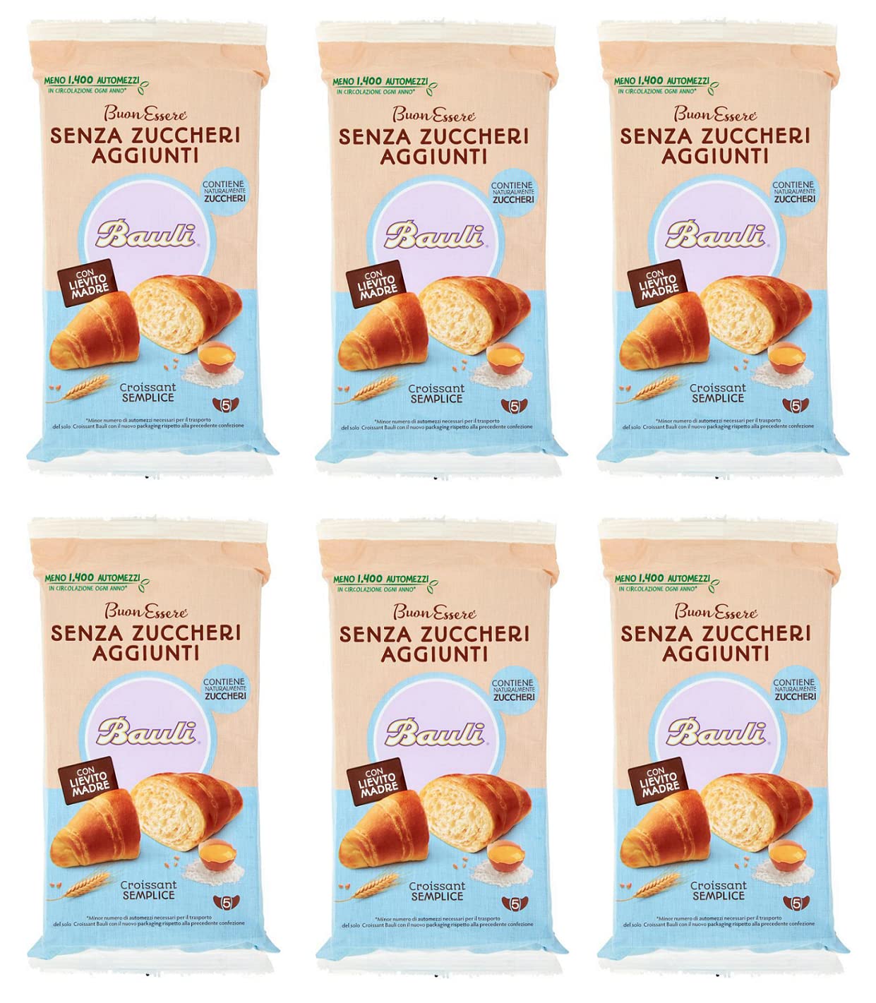 A GOOD MORNING, NATURALLY SWEET. A soft wheat flour dough, thanks to motherhood and 20 hours of natural sourdough. A simple and good morning with no added sugar. Contains natural sugar. Ingredients: wheat flour, vegetable oils and fats (palm, sunflower), free-range chicken egg yolk (6.4 ), sweetener: maltite syrup, maltite, sourdough (4.2 ) (wheat flour, water), stabilizers: sorrel syrup, malt flour, malt extract (barley), emulsifiers: mono- and diglycerides of fatty acids, brewer's yeast, skimmed milk powder, flavorings, salt, milk proteins, citrus fiber, barley malt flour. May contain soy, nuts, and mustard. Average values per 100g: Energy 1796 kJ 429 kcal, Fat 22g (of which saturates 11g), Carbohydrate 47g (of which sugars 1.7g), Fiber 1.9g, Protein 8.3g, Salt 0.23g INGREDIENTS Wheat flour, vegetable oils and fats (palm, sunflower), free-range egg yolks (6.4 ), sweetener: maltite syrup, maltite sourdough (4.2 ) (wheat flour, water), stabilizers: sorbitol syrup malt flour (barley), emulsifiers: mono- and diethyl esters of fatty acids brewer's yeast, skimmed milk powder, flavorings, salt, milk proteins, citrus fiber, barley malt flour.Bauli Cornetti Croissant Semplice Senza Zuccheri Aggiunti con Lievito Madre Croissant Sans sucre ajouté au levain Lot de 185 g, chaque paquet contient 5 croissants de 37 gDESCRIPTION DU PRODUIT DESCRIPTION DU PRODUIT UN BONNE MORGEN NATÜRLICH SÜßEN Ein weicher Blätterteig, der dank Mutterhefe und 20 langen Stunden natürlichen Sauerteigs erhalten wird. Un matin simple et bon sans sucre ajouté. Contient du sucre naturel. Ingrédients : farine de blé, huiles végétales et graisses (palme, tournesol), jaune d'œuf de poulet en libre circulation (6,4 ), édulcorant : sirop de maltite, maltite, levain (4,2 ) (farine de blé, eau), stabilisants : sirop de sorbite, farine de malt, extrait de malt (orge), émulsifiants : mono- et Diglyceri des acides gras alimentaires, levure de bière, lait écrémé en poudre, arômes, sel, protéines de lait, fibre d'agrumes, farine de malt d'orge. Peut contenir du soja, des fruits à coque, de la moutarde. Valeurs moyennes pour 100 g : énergie 1796 kJ 429 kcal Lipides 22 g dont acides gras saturés 11 g glucides 47 g dont sucre 1,7 g fibres 1,9 g protéines 8,3 g sel 0,23 g INGRÉDIENTS Farine de blé, huiles et graisses végétales (palme, tournesol), jaunes de poules en roue libre (6,4 ), édulcorant: sirop de maltite, maltite levain (4,2 ) (farine de blé, eau), stabilisants: sirop de sorbitol farine de malt (orge), émulsifiants : mono- et dily. céride de nourriture acides ségraisseux levure de bière, lait écrémé en poudre, arômes, sel, protéines de lait, fibre d'agrumes, farine de malt d'orge.