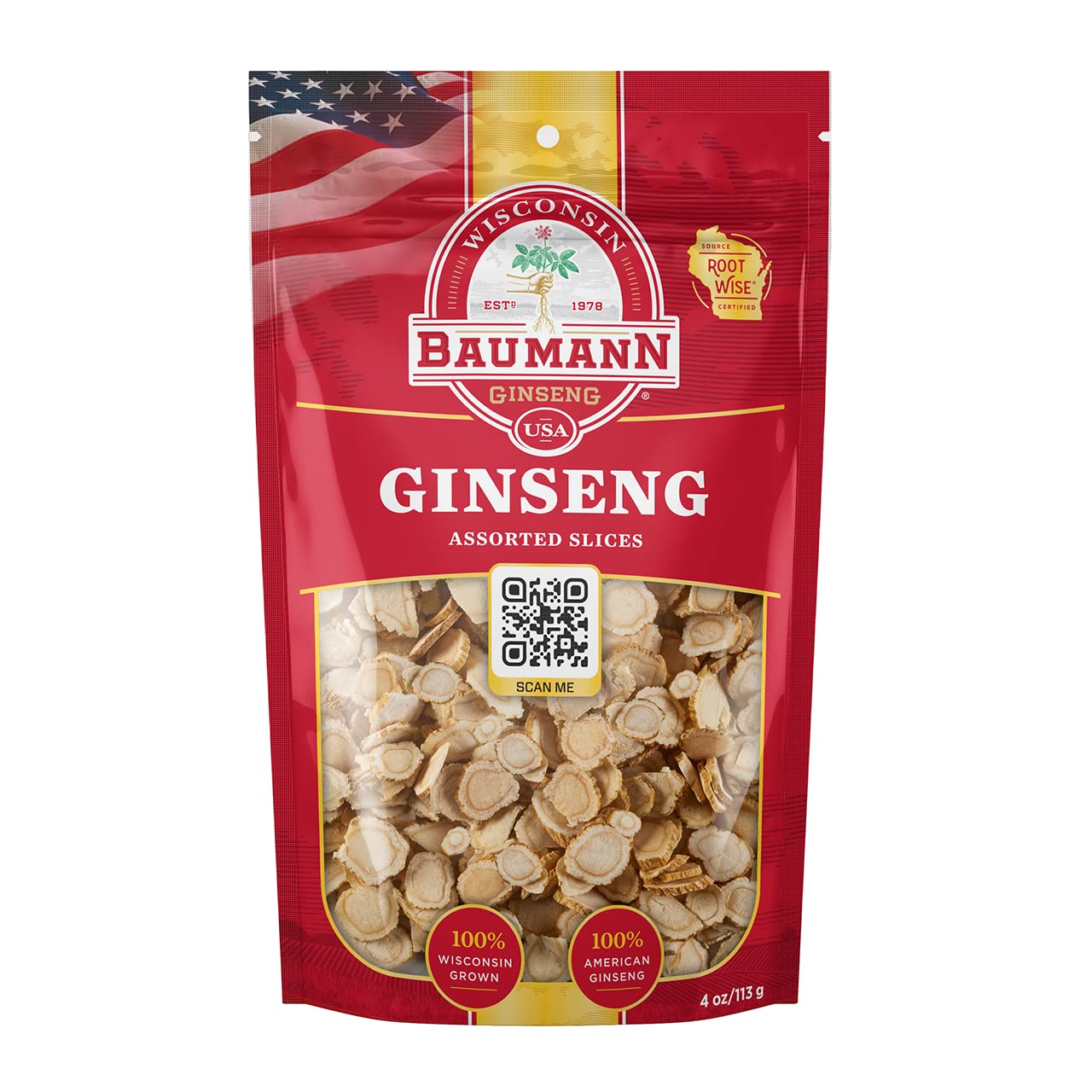 Wisconsin's largest producer of American ginseng: The Baumann family is the largest grower of ginseng in central Wisconsin and our saga dates way back since 1978. Our farms have the fertile, glaciated nutrient-rich soils, climate, growing experience technology to produce the finest Wisconsin-grown ginseng for your consumption. Get the real thing: We only grow and sell Wisconsin ginseng. On the back of every package you'll see two coded symbols. To verify that your purchase is authentic Baumann Wisconsin-grown American ginseng, simply scan the QR code with your smartphone. 100 Natural ginseng: Our American ginseng slices are prepared with hand picked ginseng roots from the farms so that you get only the best! Our dried ginseng slices are rich in antioxidants and adaptogens like flavonoids and ginsenosides help to enhance focus and energy. 100 Natural ginseng: Our American ginseng slices are prepared with hand picked ginseng roots from the farms so that you get only the best! Our dried ginseng slices are rich in antioxidants and adaptogens like flavonoids and ginsenosides help to enhance focus and energy. Premium ginseng slices: Enrich your diet with the goodness of the finest ginseng slices. Add the one or two Wisconsin ginseng slices to your favorite chicken soup recipe, morning tea and even to smoothies and shakes for a healthy and tasty twist!.