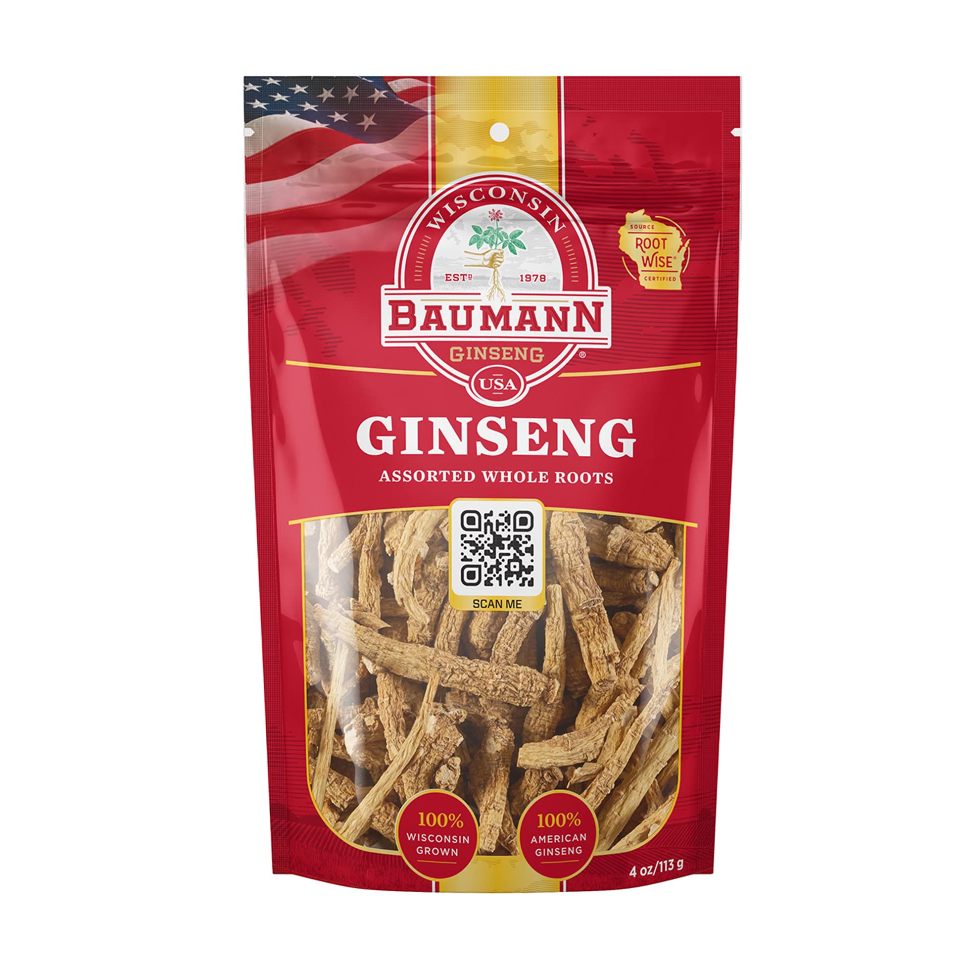 Wisconsin's largest producer of American ginseng: The Baumann family is the largest grower of ginseng in central Wisconsin and our saga dates way back since 1978. Our farms have the fertile, glaciated nutrient-rich soils, climate, growing experience technology to produce the finest Wisconsin-grown ginseng for your consumption. Get the real thing: We only grow and sell Wisconsin ginseng. On the back of every package you'll see two coded symbols. To verify that your purchase is authentic Baumann Wisconsin-grown American ginseng, simply scan the QR code with your smartphone. Why choose American ginseng? American ginseng roots owe their nutritious treasure to the fertile and rich Wisconsin soils. Panax ginseng is loaded with 16 different kinds of minerals, 17 kinds of amino acids, polysaccharides and vitamins. No wonder it is known as the golden standard among ginsengs!. 100 Natural ginseng: Our ginseng whole roots are hand picked from the farms so that you get only the best! Our dried ginseng roots are rich in antioxidants and adaptogens like flavonoids and ginsenosides which revitalize your mind and body from within for enhanced focus, memory and energy. Premium ginseng roots: Enrich your diet with the goodness of the finest ginseng roots. Add the one or two Wisconsin ginseng roots to your favorite chicken soup recipe, morning tea and even to smoothies and shakes for a healthy and tasty twist!.