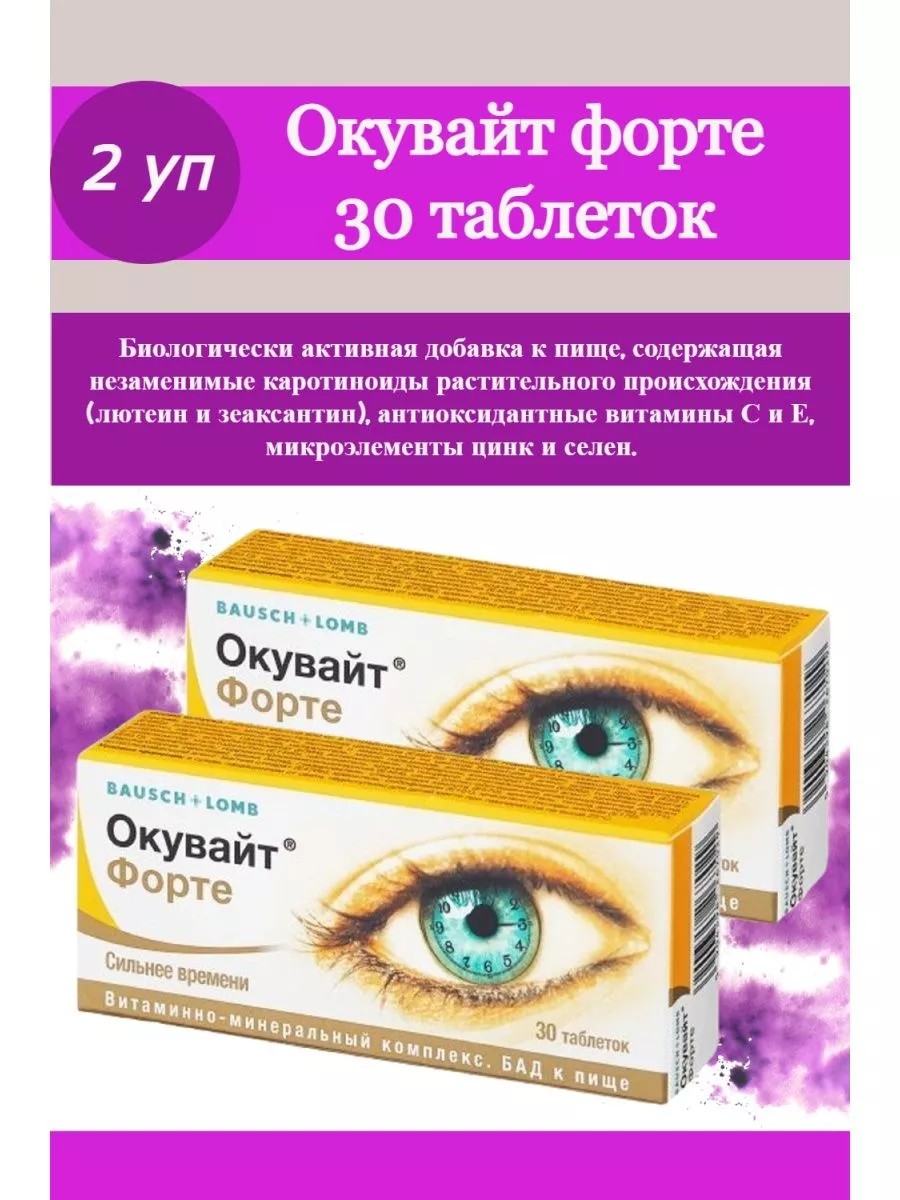 Окувайт форте – это биологически активная добавка (БАД) к пище, которая содержит в своем составе лютеин, зеаксантин, витамин С, витамин Е, цинк и селен. Окувайт форте помогает поддерживать зрение в норме и облегчает приспособление глаз к различным условиям, таким как длительная работа за компьютером, ночное видение и яркий свет. Клинические исследования показали, что длительный прием лютеина и зеаксантина повышает плотность макулярного пигмента и способствует поддержанию высокой остроты зрения. Перед началом применения Окуютайт Форте рекомендуется проконсультироваться с врачом.СПОСОБ ПРИМЕНЕНИЯ И ДОЗЫ:Взрослым по 1 таблетке 1 раз в день во время еды. Продолжительность приема – 1 месяц.