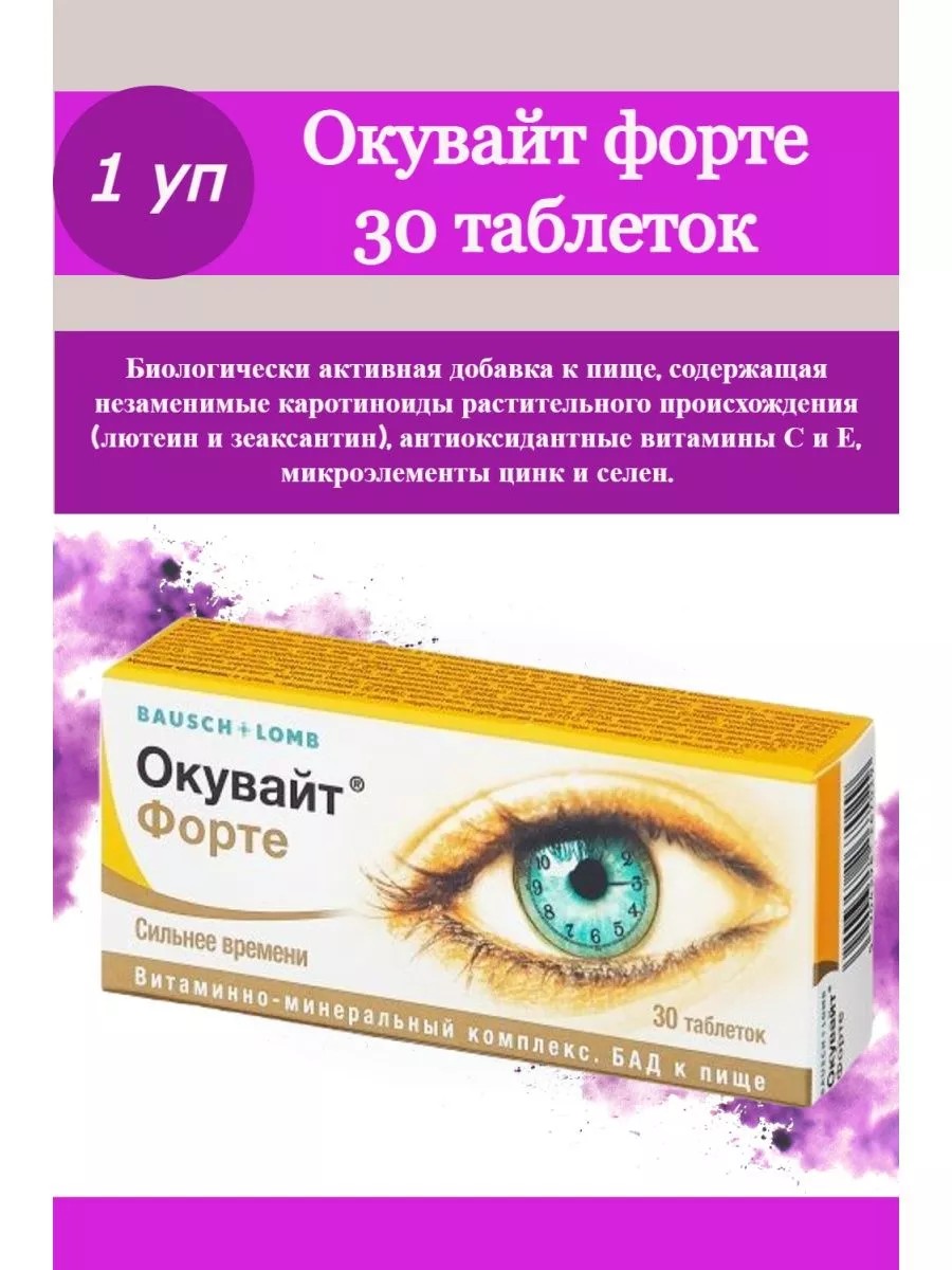Окувайт форте – это биологически активная добавка (БАД) к пище, которая содержит в своем составе лютеин, зеаксантин, витамин С, витамин Е, цинк и селен. Окувайт форте помогает поддерживать зрение в норме и облегчает приспособление глаз к различным условиям, таким как длительная работа за компьютером, ночное видение и яркий свет. Клинические исследования показали, что длительный прием лютеина и зеаксантина повышает плотность макулярного пигмента и способствует поддержанию высокой остроты зрения. Перед началом применения Окуютайт Форте рекомендуется проконсультироваться с врачом.СПОСОБ ПРИМЕНЕНИЯ И ДОЗЫ:Взрослым по 1 таблетке 1 раз в день во время еды. Продолжительность приема – 1 месяц.