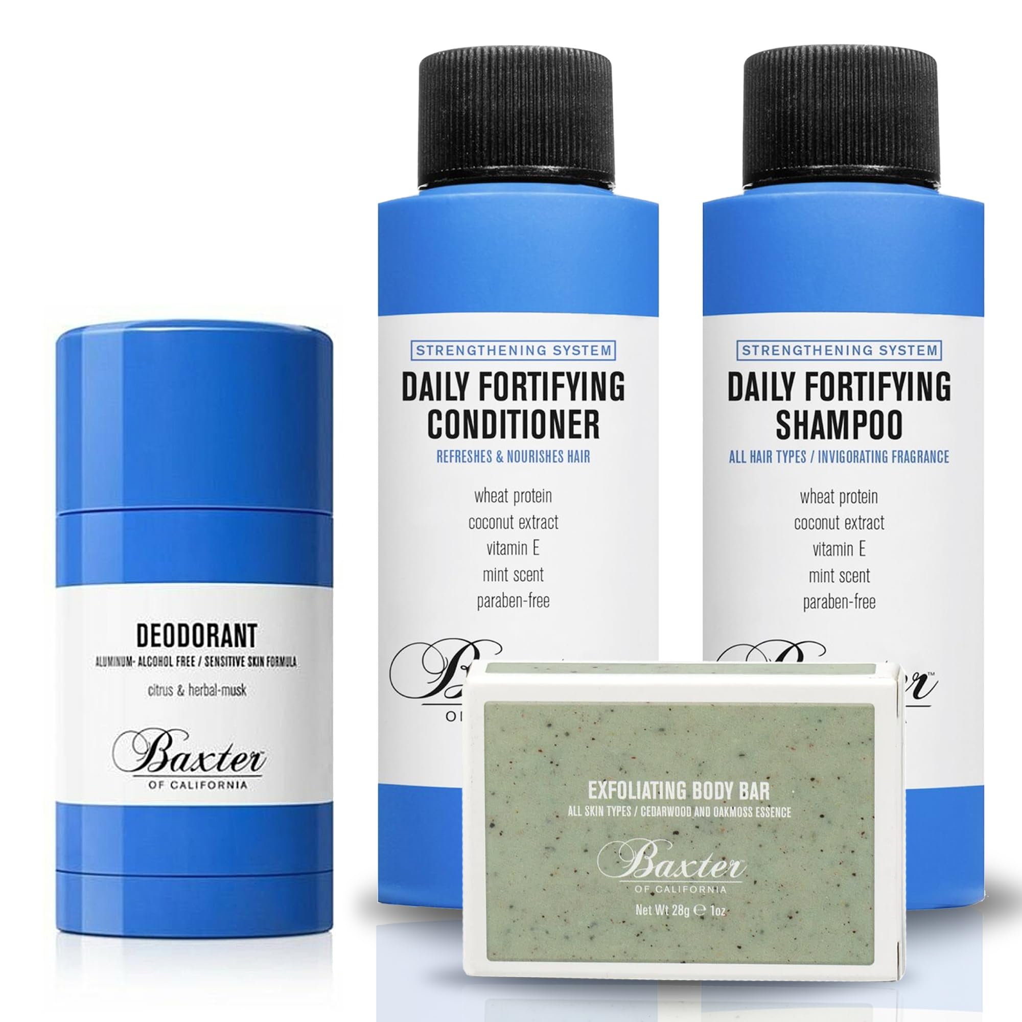 Enhance your travel grooming routine with the Baxters of California Travel Essential Shower Kit. Designed to deliver convenience and quality, this complete set includes all the essentials you need for a refreshing and revitalizing shower experience on the go. All-in-one shower solution Our travel set includes shampoo, conditioner, deodorant and cleansing bar, making it the perfect companion for your travel adventures. Each product has been carefully formulated to deliver exceptional results, ensuring you feel confident and refreshed wherever you go. Nourish your hair Our shampoo and conditioner are specially designed to suit all hair types. Whether you have color treated, dry, damaged or wavy hair, our nourishing formula will cleanse, hydrate and restore your hair, leaving it soft, manageable and full of life. Stay fresh all day long Don't let travel compromise your freshness. Our deodorant provides long-lasting protection against odor, keeping you confident and smelling good no matter the challenges of your journey. Revitalizes your skin Let yourself be tempted by the cleansing power of our revitalizing soap. Formulated with skin-nourishing ingredients, it effectively removes dirt and impurities, leaving your skin smooth, refreshed and ready to take on the day. Natural and cruelty-free We believe in the power of nature and ethical practices. That's why our shower set is proudly vegan and cruelty-free. You can enjoy your grooming routine knowing that no animal ingredients are used and our products are never tested on animals. Trust Baxters of California Baxters of California is a trusted name in grooming. With a commitment to quality and innovation, we deliver products that meet the highest standards. Our shower set is no exception, providing you with premium grooming essentials for a superior shower experience. Convenient travel size Designed to meet your travel needs, our products are available in convenient travel sizes that comply with airport regulations. Pack them in your carry-on or toss them in your gym bag for grooming on the go. Upgrade your travel grooming routine with the Baxters of California Travel Shower Set. Discover the convenience, quality and exceptional performance of our all-in-one shower solution. Trust Baxters of California for your grooming needs and embark on your travels feeling fresh, confident and ready to take on the world. Content : Baxter of California P1433700 Daily Strengthening Conditioner, 60 ml Baxter of California P1638600 Exfoliating Body Bar, 28g Baxter of California P1322901 Alcohol Free Deodorant, 34g Baxter of California P1433400 Daily Strengthening Shampoo, 60 ml DIRECTIONS FOR USE 1. Use travel shampoo: wet your hair, apply shampoo, lather and rinse thoroughly. 2. Conditioner: After shampooing, conditioner, leave for a few moments, then rinse. 3. Apply deodorant: shower, deodorant on the armpits, long-lasting protection against odors. 4. Exfoliating Cleansing Bar: When you rub the bar on a washcloth or loofah, cleanse the body. SAFETY WARNING Avoid contact with eyes. External use only. Basters of California Quality: Trust the reputation of Baxters of California, a renowned brand known for its commitment to quality grooming products. Our shower set delivers exceptional results, giving you the confidence and satisfaction that comes from using premium grooming essentials. Vegan and Chemical-Free: We believe in the power of natural ingredients. Our shower set is proudly vegan and formulated with plant-derived ingredients, ensuring no animal-derived ingredients are used. In addition, our products are free from harsh chemicals, making them gentle on your hair and skin. Ideal for All Hair Types: Whether you have short, long, medium-length, color-treated, dry, damaged, or wavy hair, our travel set is suitable for all hair types. Our shampoo and conditioner provide the nourishment and moisture needed to keep your hair healthy and vibrant, no matter your specific needs. Refreshing and revitalizing: Treat yourself to a refreshing and revitalizing shower experience with our carefully formulated products. Our shampoo and conditioner are designed to cleanse and nourish your hair, leaving it soft, manageable, and full of life. The deodorant keeps you feeling fresh and confident throughout the day, while the cleansing bar effectively cleanses your body, leaving your skin smooth and revitalized. Complete shower set: Enjoy the convenience of a complete travel shower set that includes all the essentials for your on-the-go grooming routine. This set includes a travel-sized shampoo, conditioner, deodorant, and cleansing bar, ensuring you have everything you need in one compact package. Améliorez votre routine de toilettage de voyage avec le kit de douche Baxters of California Travel Essential. Conçu pour offrir commodité et qualité, cet ensemble complet comprend tous les éléments essentiels dont vous avez besoin pour une expérience de douche rafraîchissante et revitalisante lors de vos déplacements. Solution de douche tout-en-un Notre ensemble de voyage comprend un shampooing, un après-shampooing, un déodorant et une barre nettoyante, ce qui en fait le compagnon idéal pour vos aventures de voyage. Chaque produit a été soigneusement formulé pour offrir des résultats exceptionnels, vous assurant que vous vous sentez confiant et rafraîchi où que vous alliez. Nourrissez vos cheveux Notre shampooing et après-shampoing sont spécialement conçus pour répondre à tous les types de cheveux. Que vous ayez des cheveux colorés, secs, abîmés ou ondulés, notre formule nourrissante nettoiera, hydratera et restaurera vos cheveux, les laissant douces, faciles à coiffer et pleines de vie. Restez frais tout au long de la journée Ne laissez pas les voyages compromettre votre fraîcheur. Notre déodorant offre une protection durable contre les odeurs, vous gardant confiant et sentant bon, quels que soient les défis de votre voyage. Revitalise votre peau Lais
