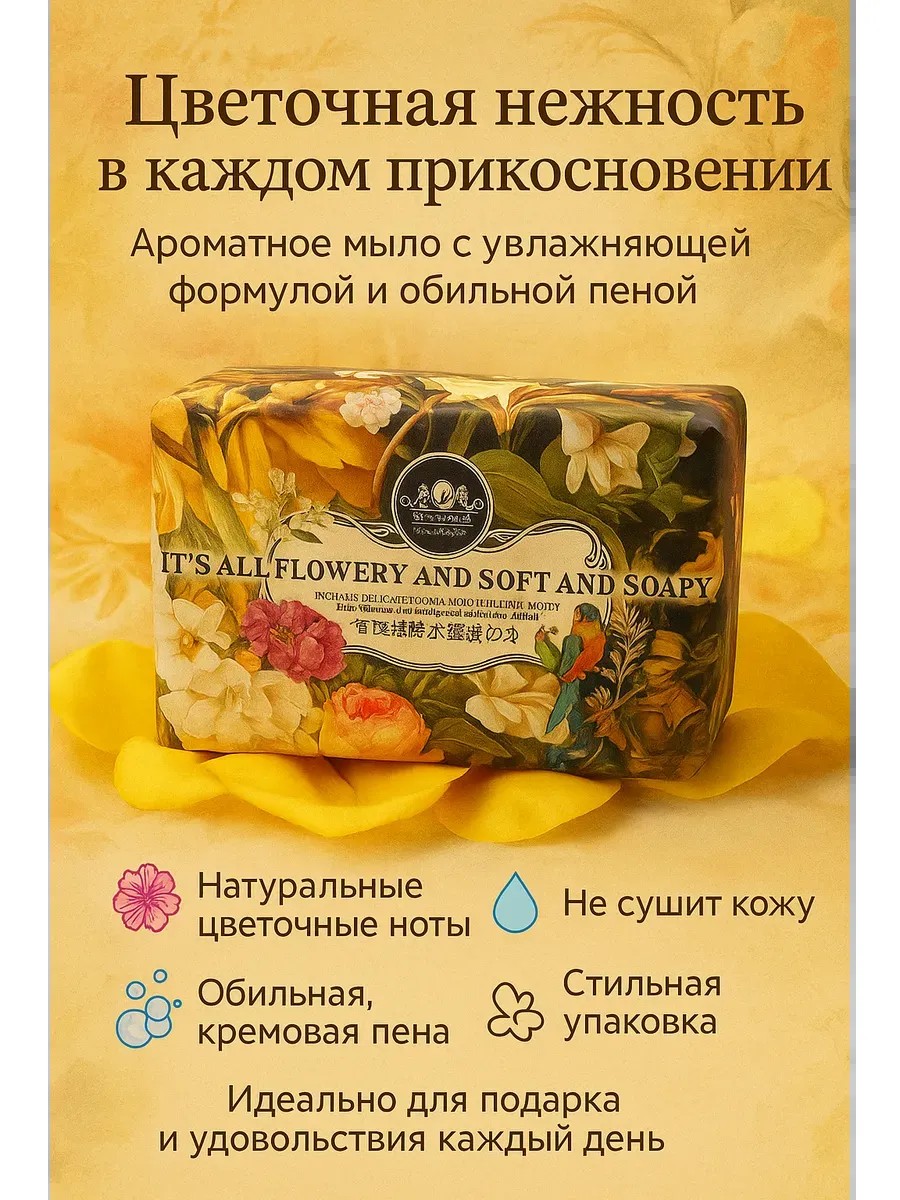 | Полное наименование товара | Парфюмированное мыло цветочном ароматом для тела и рук, 250 г — мягкое очищение и стойкий аромат |