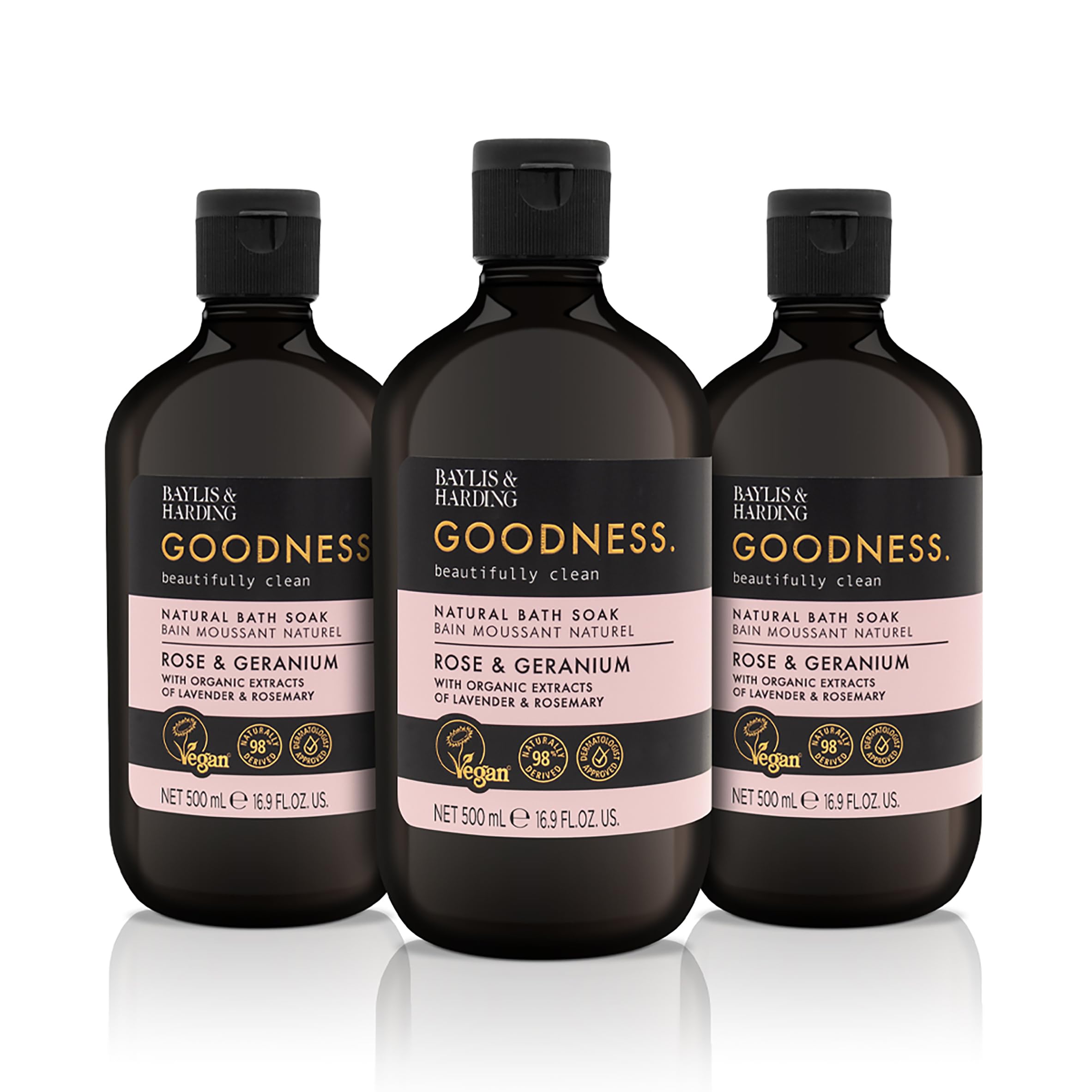 Baylis & Harding Goodness Rose & Geranium Natural Bath Soak 16.9 fl. oz (Pack of 3) - Biodegradable Formula - Vegan Friendly