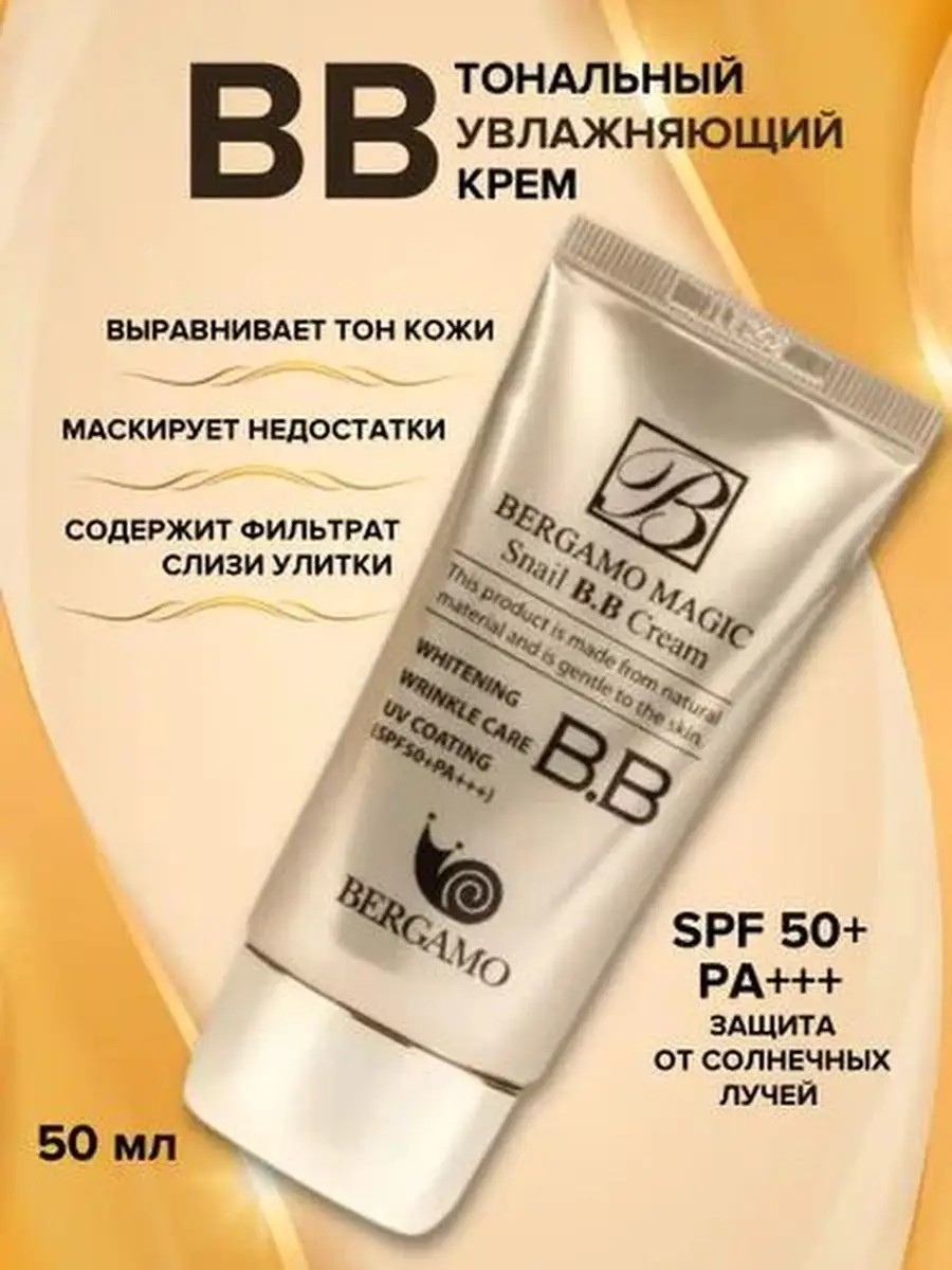 Хит продаж в магазине DiLuxe, BB крем для лица, который приобрели более 700 раз. Только у нас 100% оригинал (можно проверить на официальном сайте просканировав QR-код на упаковке). BB крем для лица Bergamo Magic Snail BB Cream SPF 50 PA+++ бб крем тройного действия с улиточным фильтратом. Выравнивает тон кожи, маскирует недостатки, сужает поры, придает лицу матовый ровный "фарфоровый" оттенок. Омолаживает, восстанавливает, убирает морщинки, питает и увлажняет кожу. Защита от солнечных лучей SPF 50+. ВВ крем помимо косметического, имеет еще и уходовое действие благодаря входящему в состав фильтрату слизи улиток. На человеческую кожу фильтрат слизи действует следующим образом: восстанавливает, придает эластичность и прочность, увлажняет, снимает кожные воспаления, заживляет следы от акне. ББ крем средней плотности, имеет насыщенный бежевый оттенок. Не выбеливает лицо и подстраивается под оттенок кожи, он хорошо растушевывается, маскирует поры и не создает эффекта маски на лице. bb крем, лицо, белита, вв крем, бб крем, bb-крем для лица, корейская бб крем, бб крем светлый, бб крем missha 21, бб крем фотошоп, бб крем для светлый кожи, бб крем для лица тональный, бб крем для лица,
