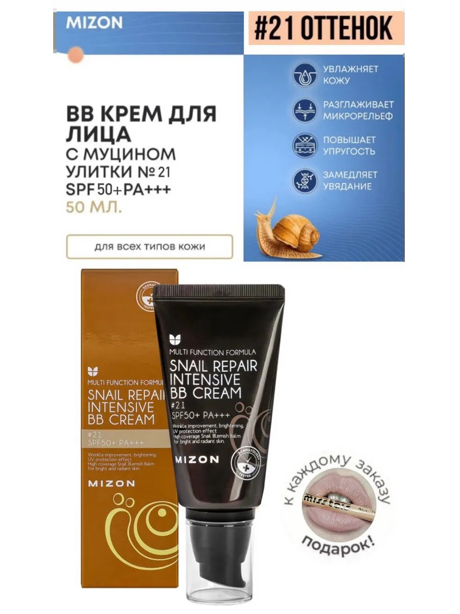 21 ТОН Mizon Snail Repair Intensive BB Cream SPF50+ РА+++ Увлажняющий ВВ-крем с муцином улитки прекрасно скрывает несовершенства кожи, улучшает тон и возвращает лицу естественное сияние. Также продукт обладает уходовыми функциями — увлажняет и способствует удержанию влаги в клетках кожи, ускоряет процессы регенерации и дает омолаживающее действие. Легкая текстура крема не утяжеляет и не создает эффект маски, удобно распределяется и подстраивается под тон кожи. Содержит 35% улиточного муцина. Интенсивно увлажняет, устраняет сухость и шелушения, создает на поверхности кожи особое защитное покрытие, которое препятствует испарению влаги из кожи. Активизирует процессы регенерации и обновления клеток эпидермиса. Идеально подходит для устранения несовершенств, тусклости и серого тона кожи. Безопасная формула, подходящая для чувствительной кожи. Продукт не вызывает зуда, раздражений и покраснений. Он не содержит парабенов и искусственных ароматизаторов. Легкая текстура с сияющим финишем. Преимущества: Способствует повышению упругости кожи, обладает легким омолаживающим действием и замедляет процессы старения; Уникальная система Moisture Capturing System - Повышает абсорбирующую способность кожи, – нормализует водно-жировой баланс эпидермиса, – успокаивает и ускоряет процессы заживления.