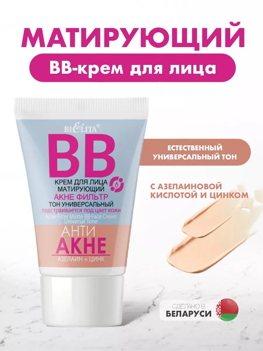 BB крем Анти Акне, тон универсальный. Матирующий ВВ-крем «АКНЕ ФИЛЬТР» (30 мл.) Белита не только обеспечивает исключительное покрытие, но и действует как ухаживающее средство. BB - крем для лица тональный сохраняет свежесть и бархатистость с утра до вечера. Тон для лица обогащен компонентами, которые помогают справиться с проблемой акне. Средство против несовершенств с легким комфортным покрытием увлажняет и ухаживает за кожей 24 часа, выравнивает тон для лица и рельеф кожи, не создавая эффект маски. Основа под макияж придает естественное сияние, свежий и отдохнувший вид. Азелаиновая кислота в составе, предотвращает появление черных точек, неустанно работая над тем, чтобы не допустить появления высыпаний. Цинк контролирует избыточное выделение жира, что делает его идеальным выбором для тех, кто склонен к жирной коже. BB-крем легко адаптируется к различным оттенкам кожи, обеспечивая естественное и ровное покрытие для всех. Тональная основа с ухаживающей формулой и тонирующими частицами маскирует покраснения, прыщи и черные точки, расширенные поры, пигментные пятна, морщины и тонкие линии, темные круги под глазами и сосудистую сеточку. Тональный крем матовый с легкой невесомой текстурой ложится ровно, не забивается в поры и морщины. Продукт не скатывается и не утяжеляет кожу, позволяя ей дышать. Техника нанесения: 1. Кистью, спонжем или подушечками пальцев нанеси тональное средство от центра лица к внешним контурам легкими похлопывающими движениями. 2. При необходимости используй тональный крем светлый на проблемные зоны вторым слоем. Матирующий крем стойкий и при этом легко смывается мицеллярной водой и салфетками. Идеальное решение для безупречно матового и совершенного цвета лица!