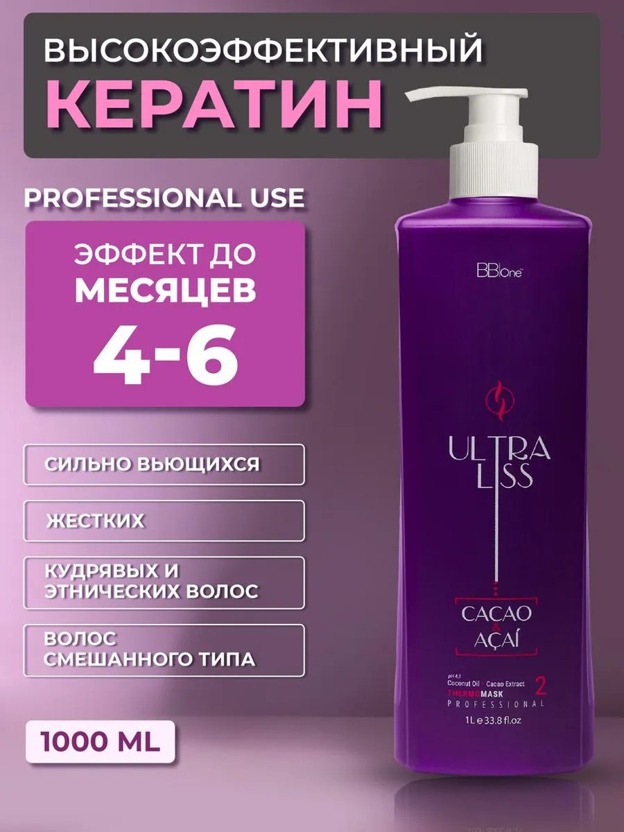 Таким образом, наш кератин для волос обеспечивает не только выпрямление, но и полноценный уход за волосами. Выбирая ULTRA LISS THERMO MASK CACAO & ACAI от BB|One, вы получаете профессиональный продукт, разработанный для использования мастерами. Он обеспечивает долговременную гладкость, рассыпчатость и восстанавливает волосы, отвечая самым высоким требованиям к качеству и эффективности.