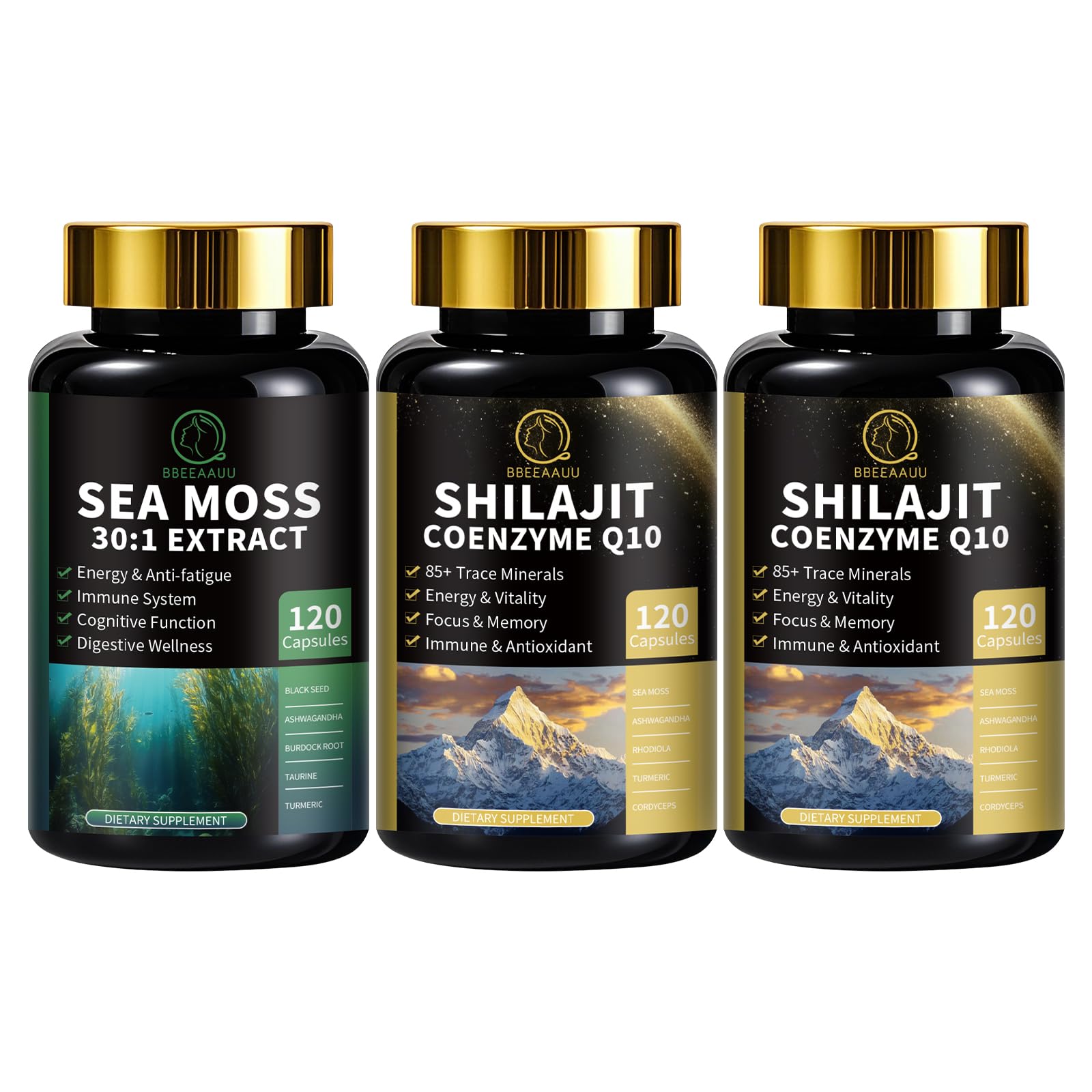 BBEEAAUU Sea Moss and Shilajit Capsules for Men Women, All in 1 Supplements with Shilajit, Sea Moss, Coenzyme Q10, Black Seed, Ashwagandha, Burdock for Energy, Antioxidant Immune SupportHigh Quality: Every batch of product is quality tested and we always adhere to high quality standards. Our capsules shilajit for men are made from high quality natural ingredients and are free from artificial additives, fillers and GMO. Himalayan Shilajit Capsules: Sourced from the pristine heights of the himalayan mountains above 18,000 feet, our Shilajit capsules for men are rich in fulvic and humic acids and over 85 trace minerals. This remarkable substance provides unparalleled performance to fully boost energy levels. 12-in-1 Shilajit Formula: Offers the most comprehensive and effective 12-in-1 formula with Shilajit, coenzyme Q10, sea moss, ashwagandha, rhodiola, turmeric and more. This combination effectively fights fatigue and improves endurance, enhancing brain function and concentration to stay in top form at all times. Coenzyme Q10 synergizes with Shilajit to promote mitochondrial oxidation, accelerating cell renewal and boosting energy and immunity. 18-in-1 Sea Moss Formula: Our sea moss capsules are enriched with 15 beneficial ingredients including sea moss, black seed, ashwagandha, taurine and burdock to provide a comprehensive and effective 18-in-1 formula carefully formulated to support digestion, energy and immunity. Dynamic Vitality Combo: Our advanced Shilajit and sea moss combinations are each enriched with a variety of potent herbal ingredients and essential nutrients, including coenzyme Q10, black seed, rhodiola and ashwagandha. This vitality combo is specifically tailored for both men and women to boost energy, enhance the immune system, antioxidant, reduce fatigue, and provide the full benefits of an all-in-one supplement.