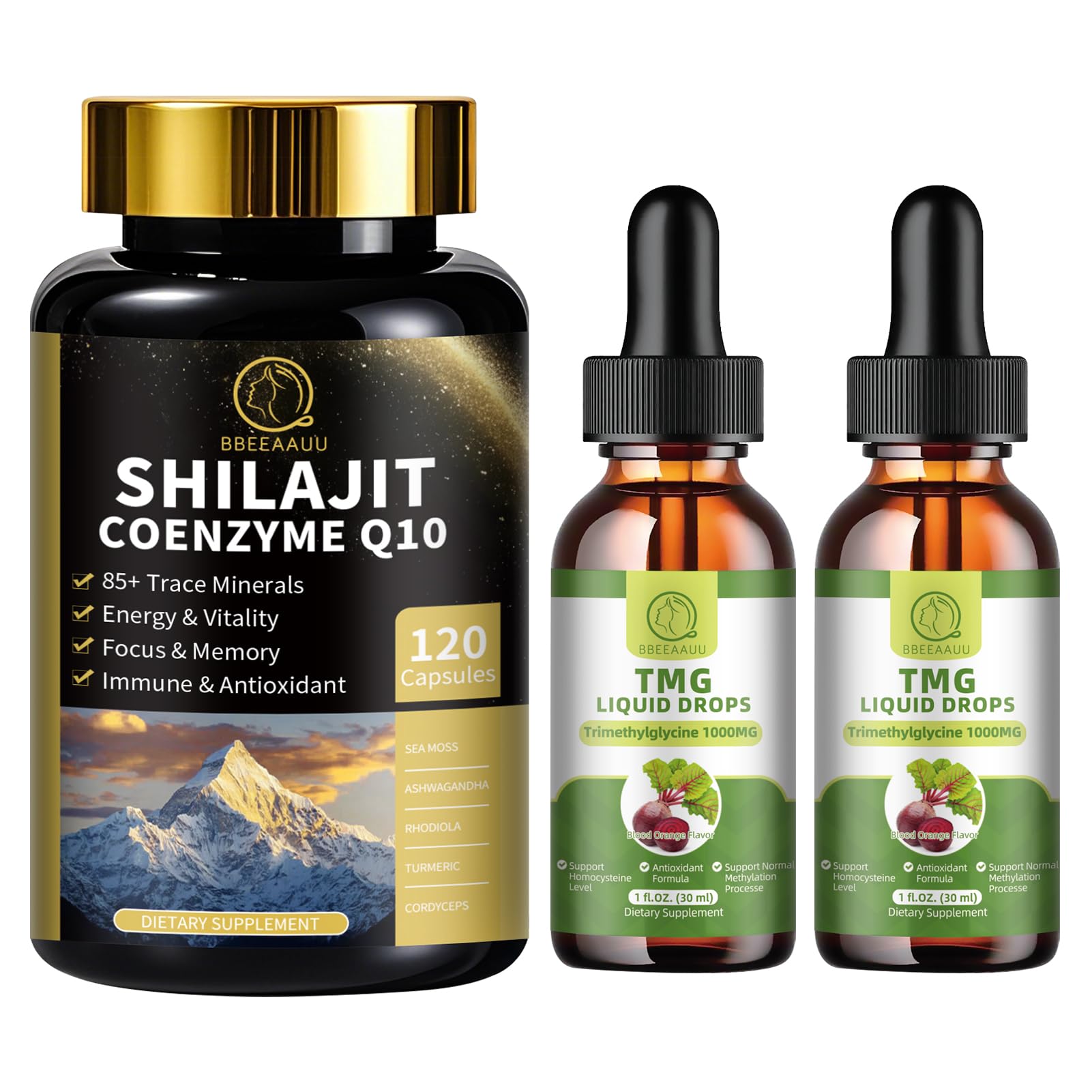 (2 Pack) TMG (Trimethylglycine) Supplement Liquid Drops, 1000MG High Absorption, Boosts Energy, Supports Methylation, Liver wellness Cognitive Function - Non-GMO, Vegan, Blood Orange Flavor, 1 Fl.Oz Shilajit Capsules with Sea Moss Ashwagandha for Men Women,12 in 1 Himalayan Shilajit Supplements with Coenzyme Q10, Fulvic Acid Humic Acid, Lion's Mane, Energy Immune Support , 120 CountSupporting Overall Health: TMG (Trimethylglycine) liquid drops are crucial for many body functions and maintaining a healthy level, help to boost energy and endurance, supports methylation,cognitive function support and liver and kidney health.TMG liquid drops also help to support liver and kidney health, energy, improve night and mood, and promote overall relaxation. Advanced Formula Rich Nutrition: The BBEEAAUU TMG (Trimethylglycine) Liquid Drops contain 1000mg of trimethylglycine (TMG), ginkgo biloba extract, rhodiola rosea extract, erigeron breviscapus extract, red sage extract, jiaogulan extract, panax notoginseng extract, grape seed extract each 50mg and 1.3mg vitamin B6. Our TMG drops provides a truly balanced basic nutritional blend that meets your daily energy needs. REINVENT THE POWER: Each capsule formula is precisely proportioned, and our Shilajit capsules realize the full synergy of Shilajit supplements with 12 potent herbal ingredients. The BBEEAAUU Shilajit capsules contain shilajit 400mg, sea moss 300mg, ashwagandha 200mg, rhodiola 150mg, lion's mane mushroom 100mg, turmeric 55mg, cordyceps 50mg, ginseng 50mg, nettle 40mg, coenzyme Q10 40mg, black pepper 5mg and zinc 5mg. Coenzyme Q10 works synergistically with Shilajit to help boost energy, fight fat. SUPPORTS OVERALL HEALTH: Shilajit capsules aids in many bodily functions and maintains a healthy level of health, combat fatigue, helps with enhanced energy, supports mood and night, supports cognition and immunity. Shilajit helps unlock the potential of your day. HIMALAYAN SHILAJIT CAPSULES: Sourced from the pristine heights of the himalayan mountains above 18,000 feet, our Shilajit capsules are rich in fulvic and humic acids and over 85 trace minerals. This remarkable substance provides unparalleled performance to fully boost energy levels.