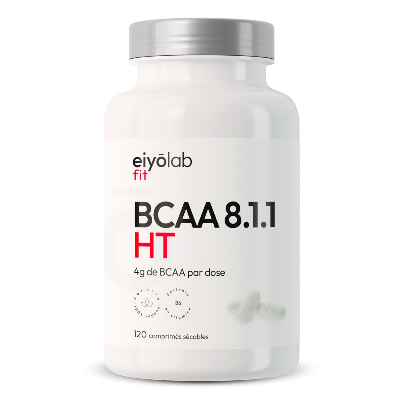 ? CUSTOMER SATISFACTION BCAA 8.1.1 is made in France from ingredients selected for their effectiveness. This product is not a substitute for a varied and balanced diet and regular physical activity. Your satisfaction is our priority. Contact us our team of nutritionists and experts will be happy to offer you personalized assistance. CONVENIENT FORMAT Its tablet format makes Eiyolab BCAA 8.1.1 very easy to take. This form allows for discreet and convenient consumption. The bottle fits easily in your bag. This is a real added value, as BCAAs help delay the onset of muscle fatigue, a key factor in progress. ENRICHED WITH VITAMIN B6 Vitamin B6 is an essential vitamin for athletes because it supports proper amino acid metabolism by promoting glycogenesis, enables the synthesis of compounds essential to the body, and plays a role in energy production. Combined with BCAAs, it directly enhances their action and helps reduce muscle fatigue. PROMOTES MUSCLE BUILDING Thanks to their anti-catabolic effect, BCAAs effectively contribute to muscle mass gain. But that's not the only reason. Leucine triggers the protein synthesis process, without which muscle building is impossible. The higher the leucine content in a protein or amino acid complex, the greater the muscle development. ?PROMOTES MUSCLE RECOVERY Eiyolab 8:1:1 BCAAs are a complex of essential amino acids for optimal muscle building and recovery. Their 8:1:1 ratio, composed of 8 parts Leucine to 1 part Isoleucine and 1 part Valine, is ideal for promoting anabolism. Whether you're a jogger, soccer player, CrossFitter, gymnast, or weightlifter, BCAAs are crucial for improving athletic performance and progress.