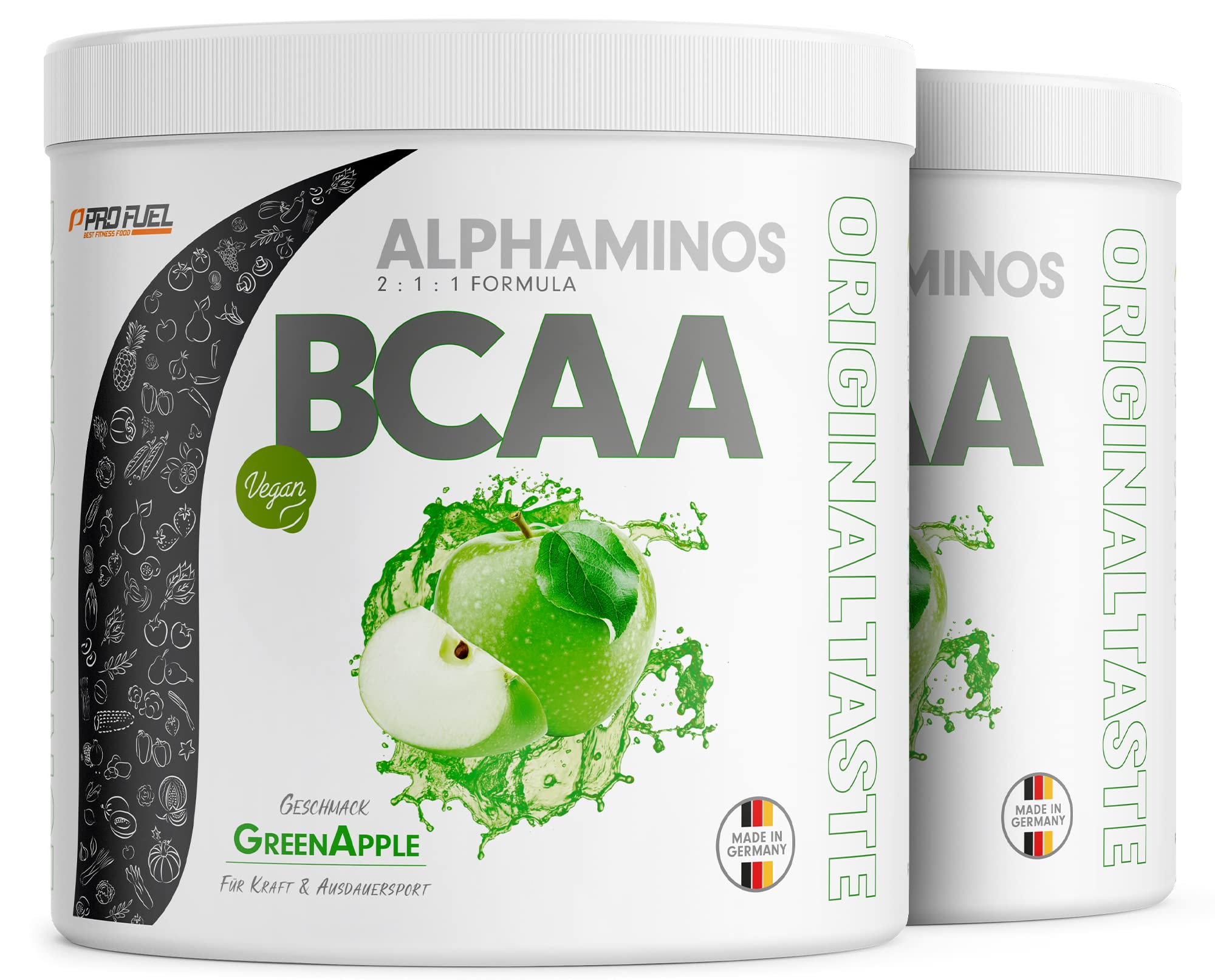 BCAA Pulver 2x300g GRÜNER APFEL - Testsieger - ALPHAMINOS BCAA 2:1:1 - Das ORIGINAL von ProFuel - Essentielle BCAA Aminosäuren - Unfassbar leckerer Geschmack - 100% vegan - Top Löslichkeit Grüner Apfel 300 g (2er Pack)