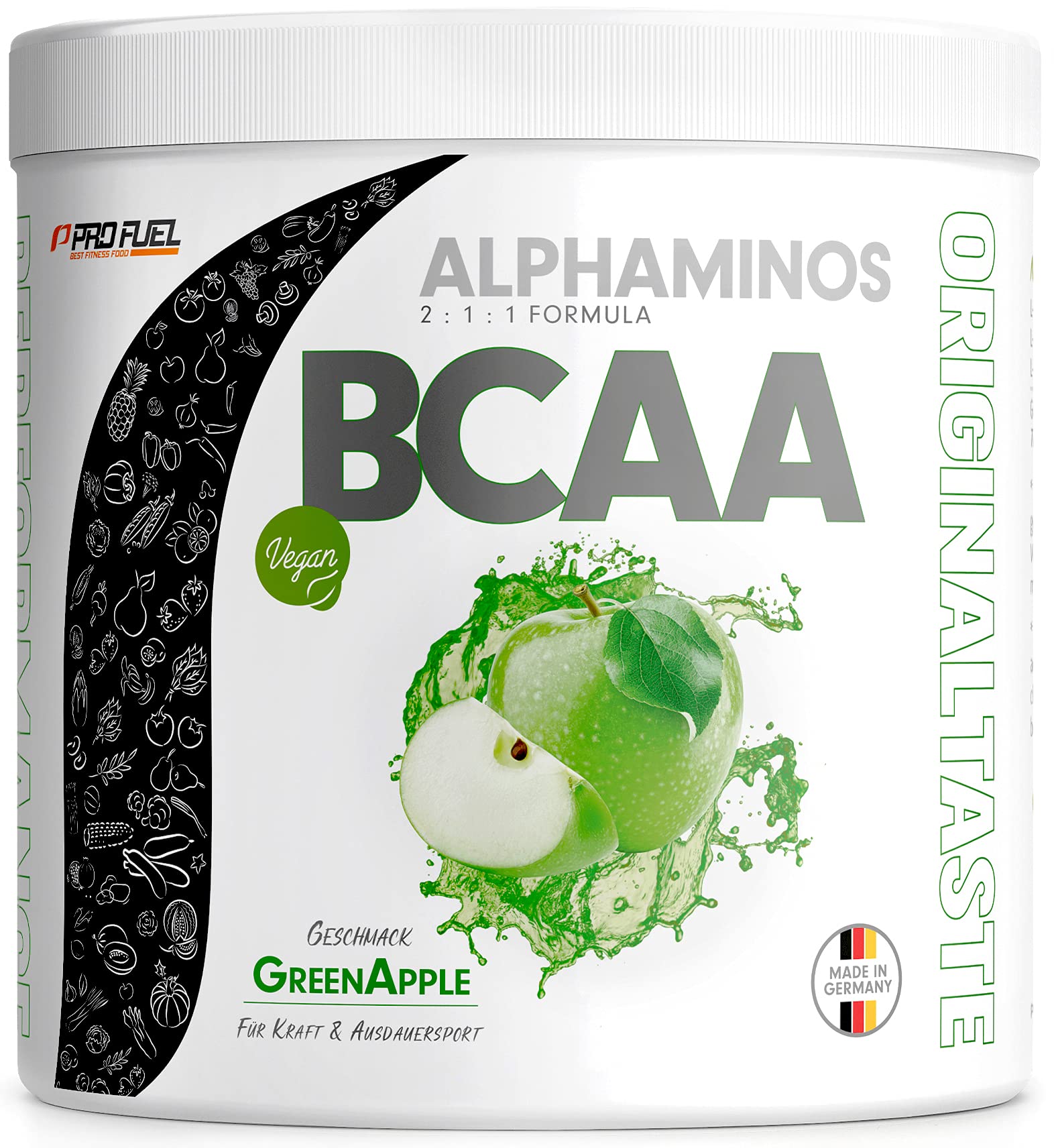 BCAA Pulver 3x300g GRÜNER APFEL - Testsieger - ALPHAMINOS BCAA 2:1:1 - Das ORIGINAL von ProFuel - Essentielle BCAA Aminosäuren - Unfassbar leckerer Geschmack - 100 vegan - Top Löslichkeit Grüner Apfel 300 g (3er Pack)