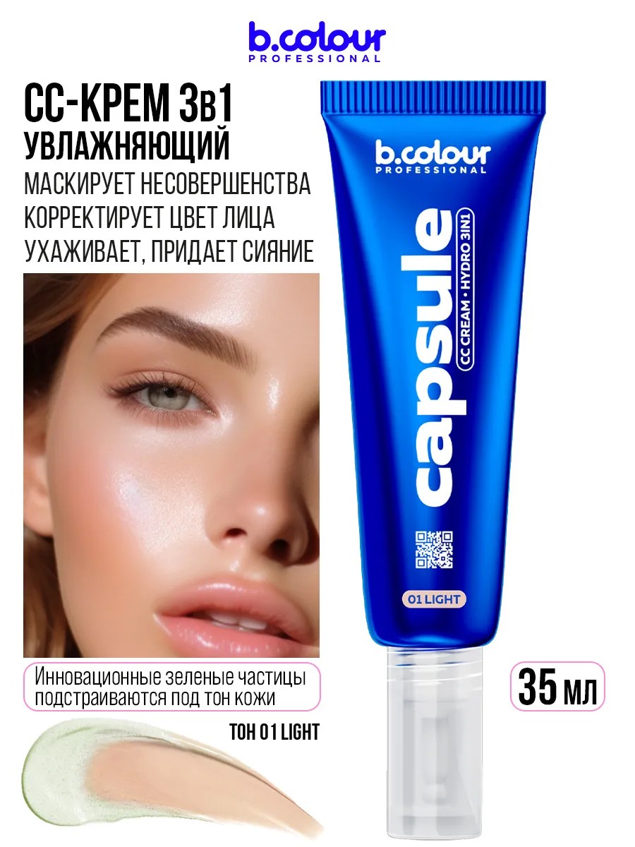 | Полное наименование товара | CC крем для лица, увлажняющий, маскирующий, с зелёными капсулами, выравнивающий, от покраснений, с эффектом макияжа без макияжа, с SPF, для чувствительной кожи, естественное сияние, тон 01 Light, B.COLOUR PROFESSIONAL, 35 мл |