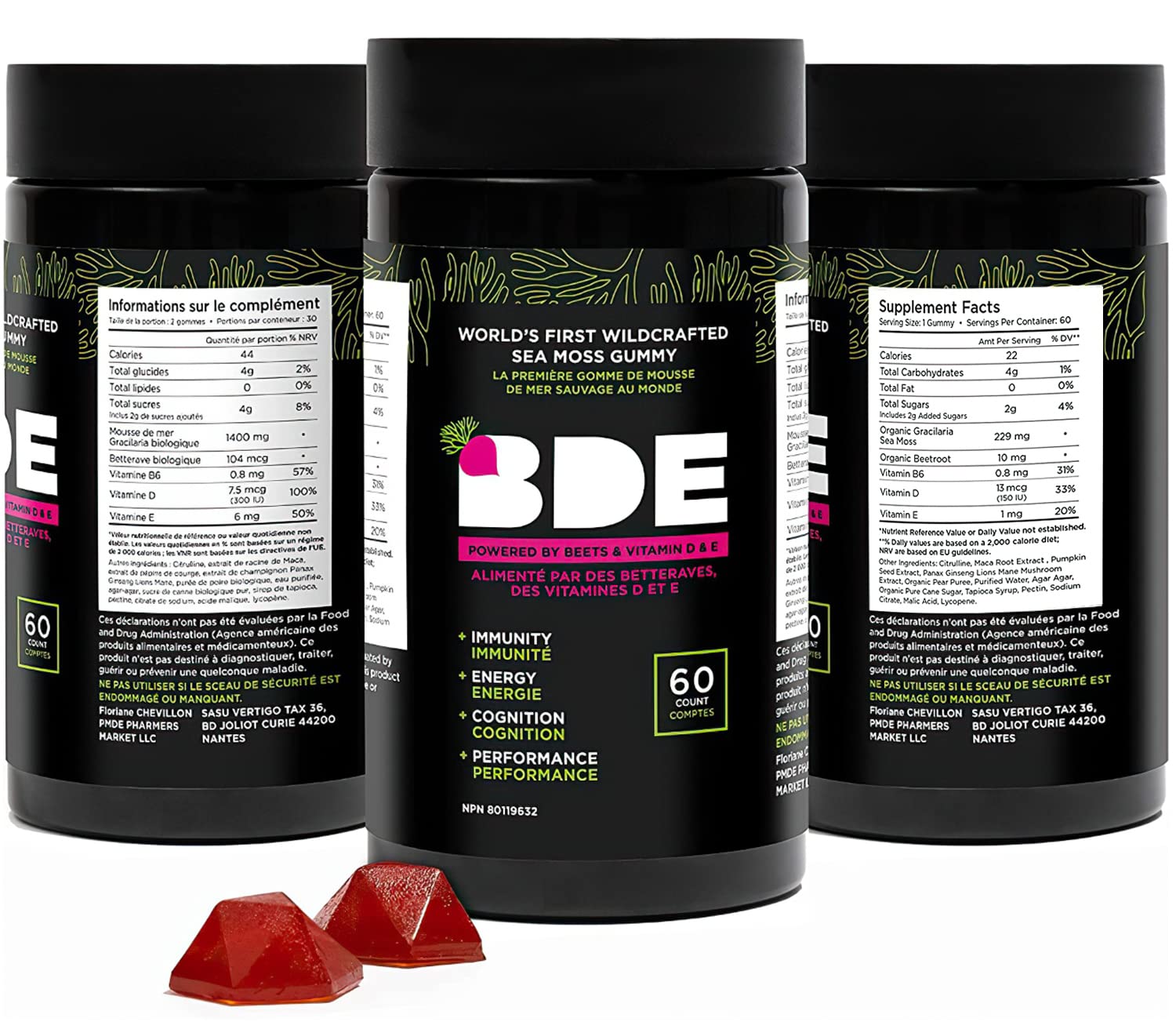 The world's first wildcrafted sea moss gummy We pick up for you the finest Gracilaria sea moss from St. Lucia and powered with beets and other natural ingredients to give you an extra boost of vitamins. Sweetened with fair trade organic cane sugar. Check out the list of powerful ingredients: Made in the USA with select ingredients thoughtfully curated from around the world. -Sea Moss is a popular superfood that comes with amazing health benefits. From aiding digestion due to our proprietary agar blend to support gut health. -Beetroot Detox the body to improve athletic performance, cognitive health fitness goals.-Pumpkin Seed Support DNA synthesis metabolism.- Watermelon Supports nerve, muscle brain function. Reduces inflammation. -Maca Root Increases strength, endurance, performance. High in antioxidants to fight free radicals. Commited with the sustainability of our oceansFor every purchase made, a portion of your dollar will be donated to GreenWave.org which is centered around one focus: bringing sustainability and regenerative ocean farming to the world's oceans.THESE GUMMIES CONTAIN NO ARTIFICIAL STUFF- Don't worry about gluten, gelatin, soy, nuts, shellfish, artificial sweeteners, salicylates, artificial coloring, artificial flavors, artificial preservatives, dairy products, eggs, glucose syrups, or low-grade oils. They are not here. VEGAN AND KOSHER FORMULA, ALLERGEN AND GLUTEN-FREE- Contains organic and non-GMO ingredients, all-natural and good for you like beets, pear, maca root, watermelon, pumpkin seeds, Lion's Mane mushrooms, and Panax ginseng. COMPLETE VITAMIN COMPLEX FOR MEN AND WOMEN- Two BDE gummies contain as much vitamin C as 6 oranges, vitamin B12 as 7 cups of milk, B6 as 6 cups of spinach, and zinc as 3 cups of raw peas. ENJOY ALL ITS OVERALL HEALTH BENEFITS- From aiding digestion due to our proprietary agar blend to support weight loss gut health. It's high in antioxidants, and supports nerve, muscle brain function.