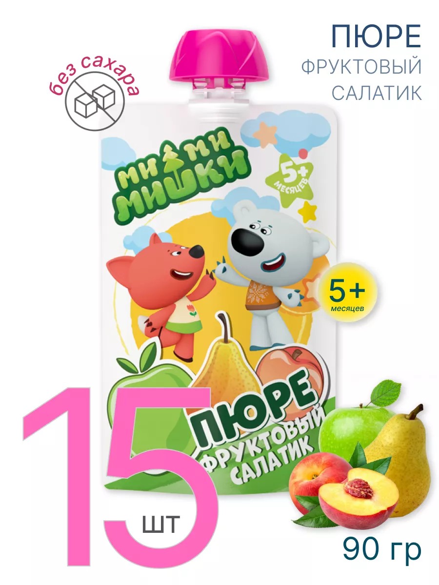 Mi-Mi-Bears Baby Puree, Fruit Salad, Sugar-Free, Homogenized, Sterilized, 90g Doypack - 15 pcs. For feeding young children (over 5 months). Ready to eat. Start with 1 teaspoon 2 times a day, gradually increasing to 100g per day by 12 months. Mi-Mi-Bears baby purees are created with your child in mind. Natural fruits are carefully processed, so the purees retain all the natural benefits and vitamins so essential for baby's development and immune system support. Children adore the vibrant flavors of Mi-Mi-Bears puree, and adults can rest assured of the clear, all-natural ingredients. This puree for babies is made exclusively from natural products, without the addition of preservatives, artificial colors, flavors, or substitutes, and does not contain genetically modified organisms (GMOs). Our baby food products are made from fruits and vegetables grown in southern Russia (Krasnodar Krai, the Republic of Adygea, Stavropol Krai, and the Kabardino-Balkarian Republic). "MiMiMishki" purees undergo multi-stage quality control and meet all safety requirements. The puree is sterilely poured into state-of-the-art packaging that preserves all the beneficial properties of this product without the use of preservatives. It is also easy to handle, environmentally friendly, and protected from various external influences. The compact packaging makes it easy to take with you on walks or trips. The new "Mi-Mi-Mishki" baby food line is based on the cartoon of the same name. In our store, you can purchase sets of 4, 8, or 15 purees, each weighing 90 grams. STORAGE CONDITIONS: Before opening, store at a temperature of 0 to 25 degrees Celsius and a relative humidity of no more than 75%. After opening, store the product in the refrigerator at a temperature of +2 to +6°C for no more than 24 hours. Do not reheat in a microwave. Taste the product before feeding your baby.