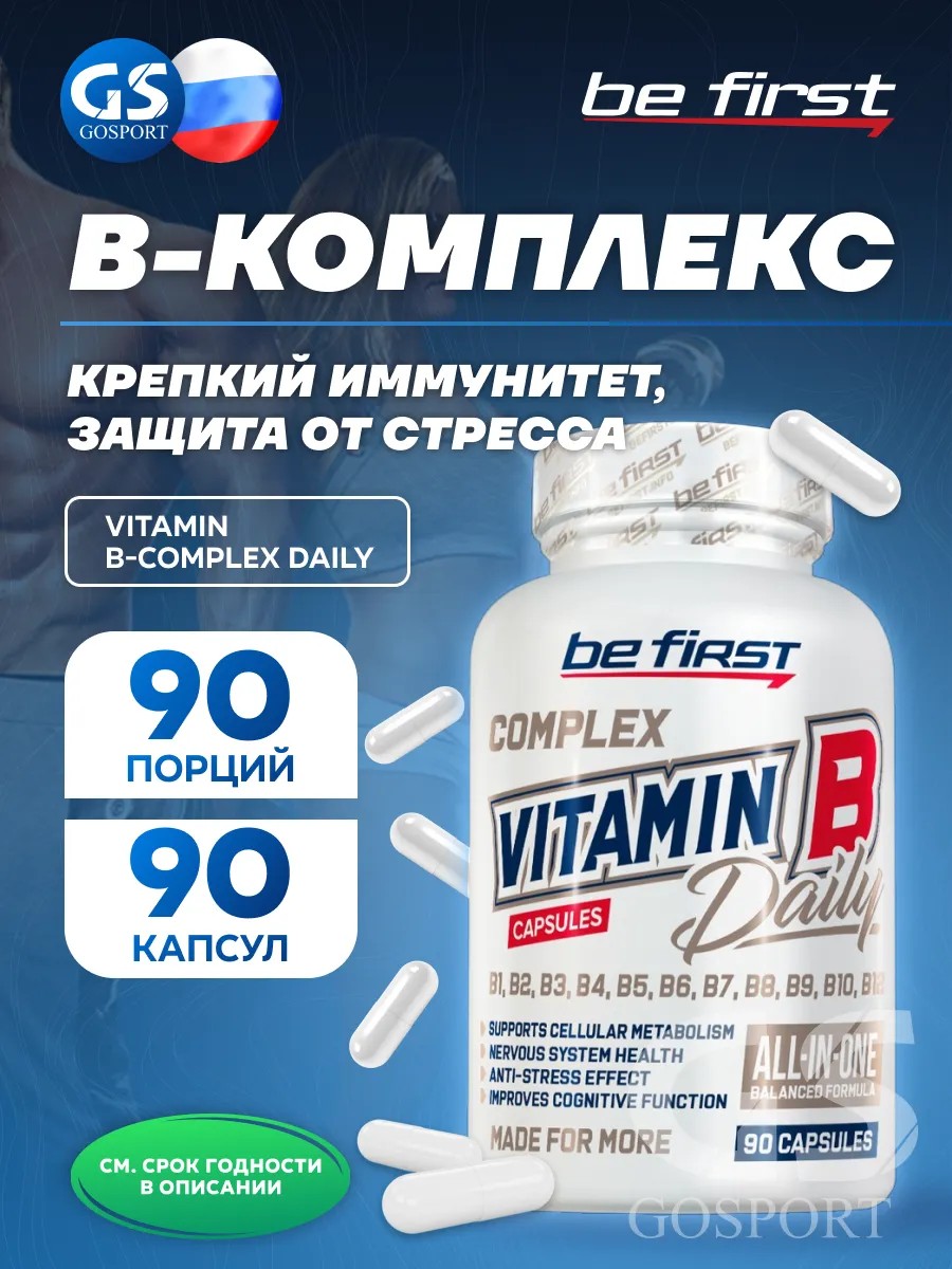 Expires until March 10, 2027. VITAMIN B-COMPLEX DAILY 90 capsules. A complex of B vitamins for recovery and improved performance. Vitamin B-complex from Be First will help cope with increased nervous tension, cope with fatigue, restore immunity, and return to work faster after illness or injury. It helps train more effectively, more efficiently supply the body's tissues with nutrients, maintain healthy skin and muscle tone, and minimize the growth of fat deposits by normalizing metabolic disorders. What is included in the complex? Vitamin B-complex is a complete set of B vitamins that regulate protein absorption, fat and carbohydrate metabolism, the synthesis of new proteins, and the construction of new immune cells. Vitamin B1 (thiamine mononitrate) Thiamine is responsible for the normal functioning of the nervous system. Its deficiency causes disruption of all body systems that depend on the quality of nerve signal transmission—the brain, muscles, cardiovascular system, and digestion. Athletic success directly depends on adequate neuromuscular interaction and requires a regular supply of vitamin B1. Vitamin B2 (riboflavin): Riboflavin is necessary for the oxidation of fatty acids, the detoxification of certain toxic metabolites, and the synthesis of hemoglobin. Without it, hormonal function (especially that of the thyroid gland) is disrupted, skin and eye condition deteriorates, ulcers and cracks in the mucous membranes appear, blood flow to all organs is impaired, and muscle weakness progresses. Taking this vitamin helps maintain healthy skin, normal vision, and muscular performance. Niacin (vitamin B3): Niacin regulates the metabolism of fats, proteins, amino acids, and carbohydrates, and the effectiveness of muscle nutrition depends on it during exercise. A deficiency of this vitamin disrupts brain function and digestion, and worsens skin condition. Regular intake of sufficient amounts of niacin helps improve blood microcirculation in tissues (including muscles and the brain), normalizes blood cholesterol, and promotes hair growth. Vitamin B6 (pyridoxine hydrochloride) Pyridoxine is a key regulator of protein absorption and amino acid metabolism. Its deficiency results in poor absorption of protein foods, circulatory problems, and decreased performance, which manifests itself in muscle weakness, arthritis, and depression. Regular exercise and a protein-rich diet are unthinkable without pyridoxine. Folic acid (vitamin B9) Vitamin B9 is required for normal blood circulation.